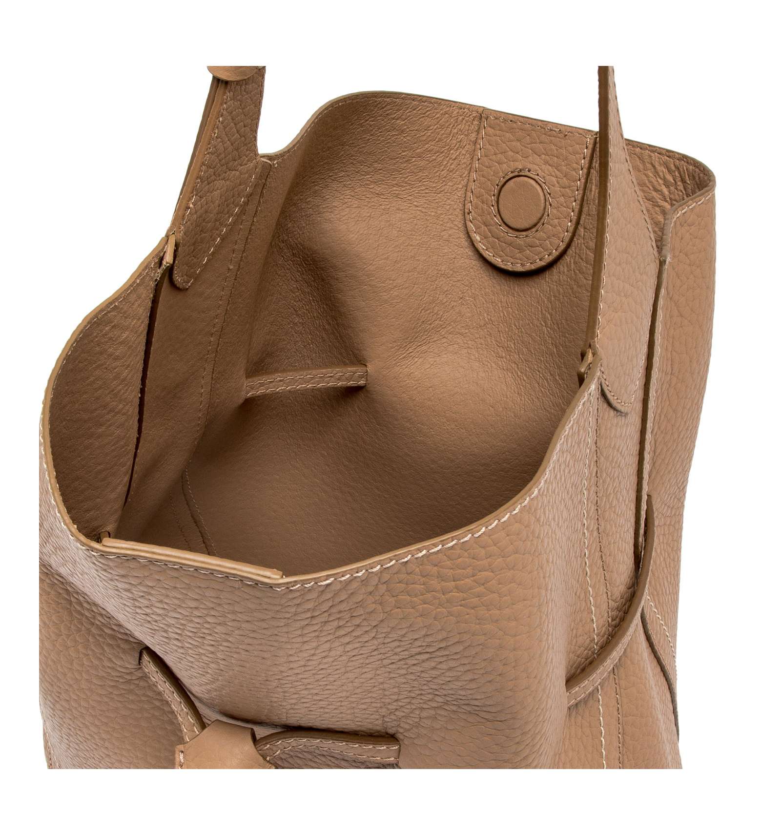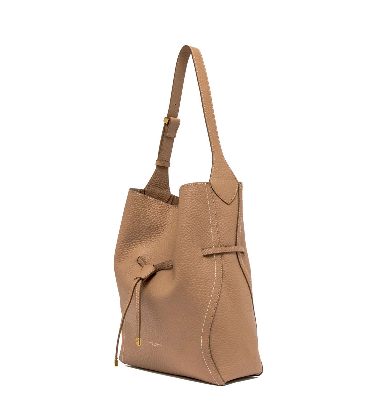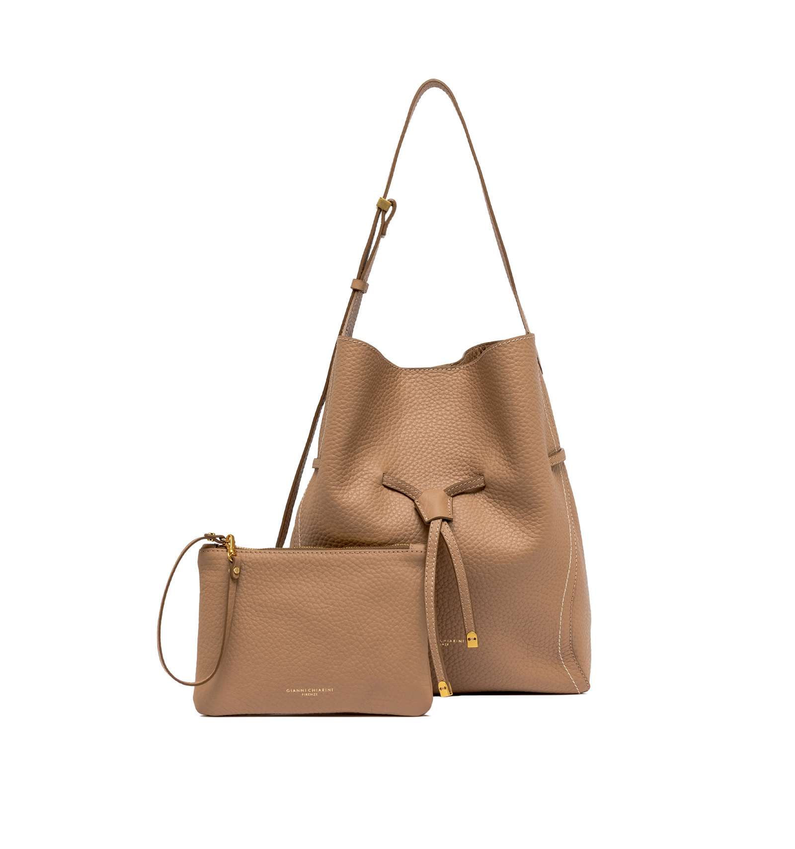 Sienna is the new bag by Gianni Chiarini Firenze, defined by a soft and feminine silhouette, perfect for completing both casual and more refined looks with style. Made of maxi grain double leather, it’s finished with contrasting stitching that highlights its lines. Features a single compartment with magnetic closure and is embellished with iconic metal details like the twin logoed loop and metal tips. Equipped with a practical clutch with zipper closure. Size: 30x34x11 cm.