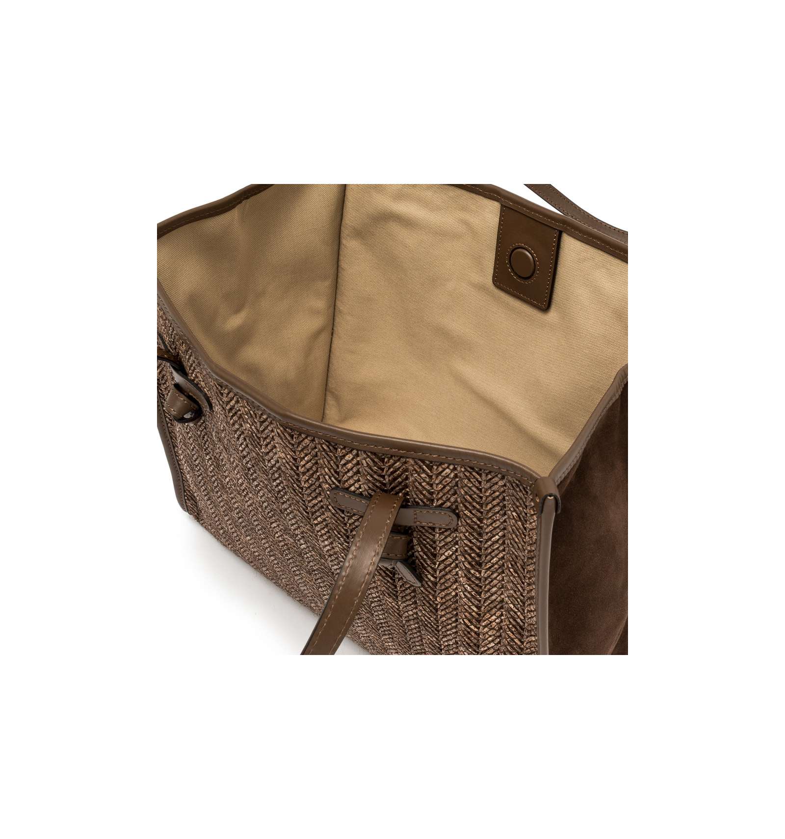 The Marcella shopping bag by Gianni Chiarini Firenze is made of herringbone straw that gives it a fresh and natural look, perfect for summer days in the city and on vacation, it is equipped with leather handles and a convenient magnetic closure, ideal for everyday use. The internal leather clutch adds practicality and versatility. Size: 38x31x16 cm.