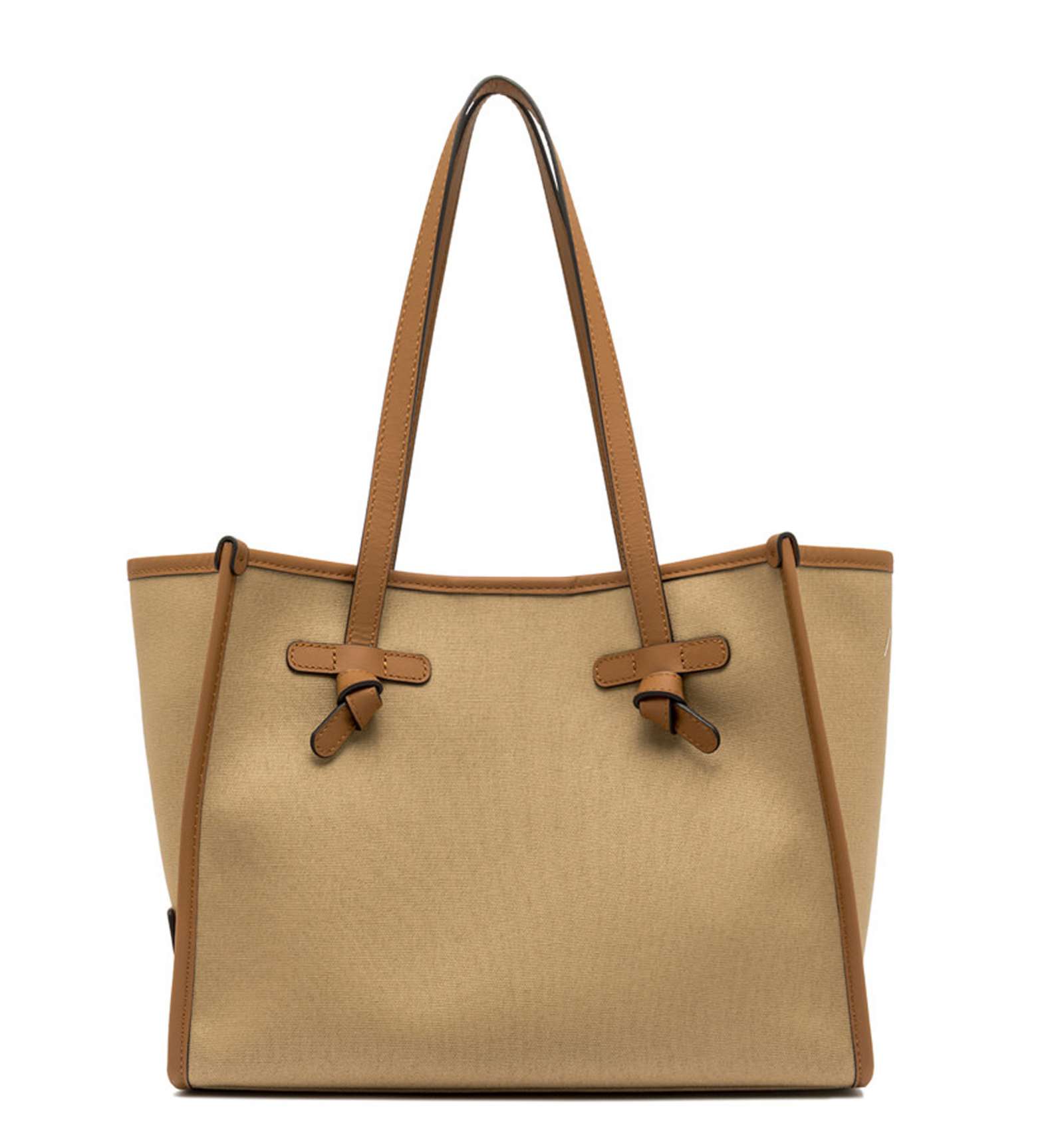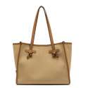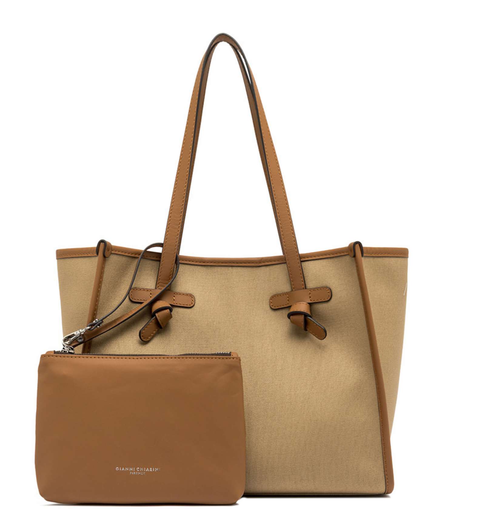 Marcella shopping bag by Gianni Chiarini Firenze, with a simple and refined silhouette, is made from canvas fabric. Perfect for everyday use, it features leather handles and a convenient magnetic clasp closure. It comes with leather profiles, which give the bag a stylish look. The internal lining and matching clutch make it a versatile accessory to complete even the simplest looks. Size: 33x25x13 cm.