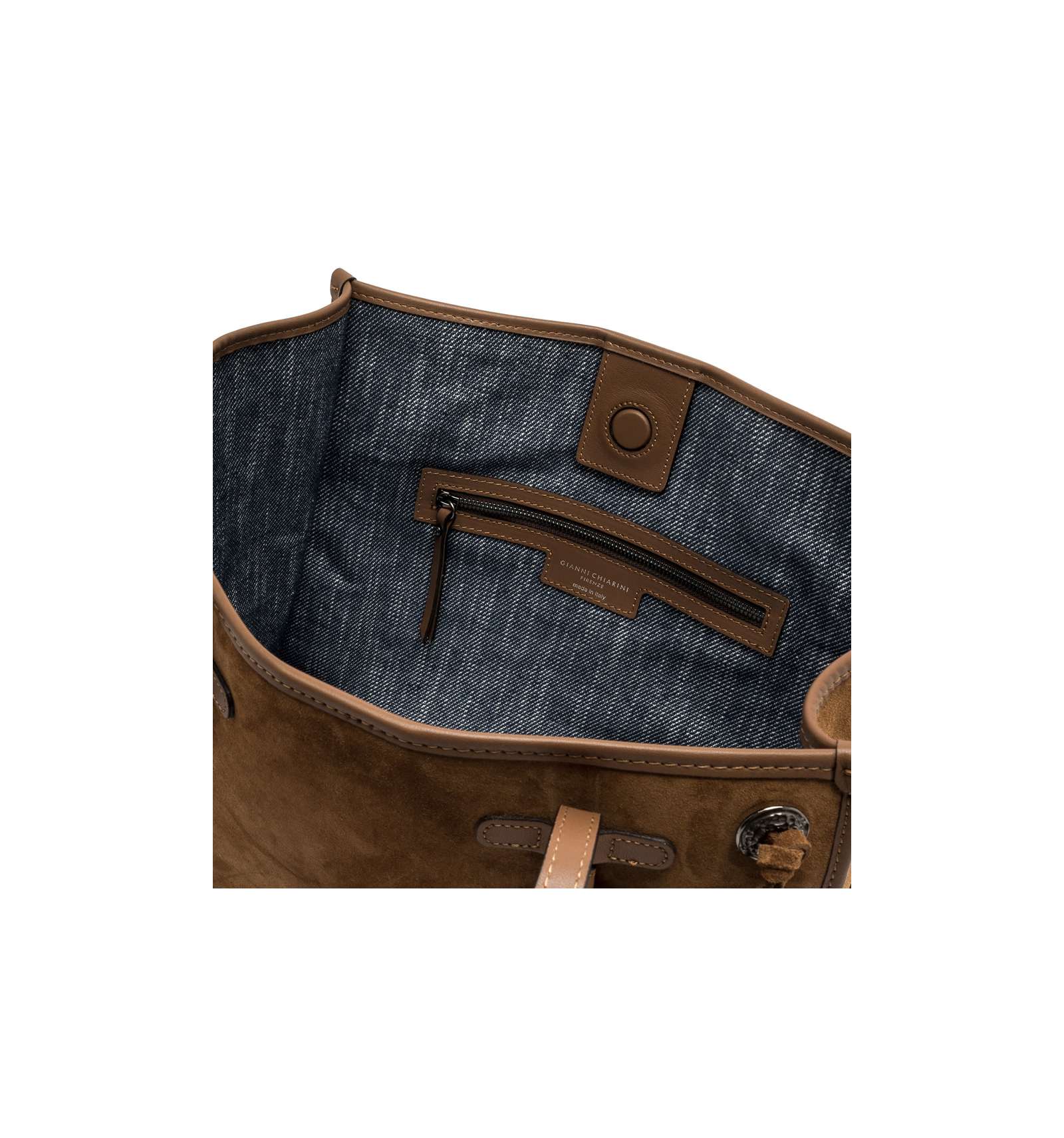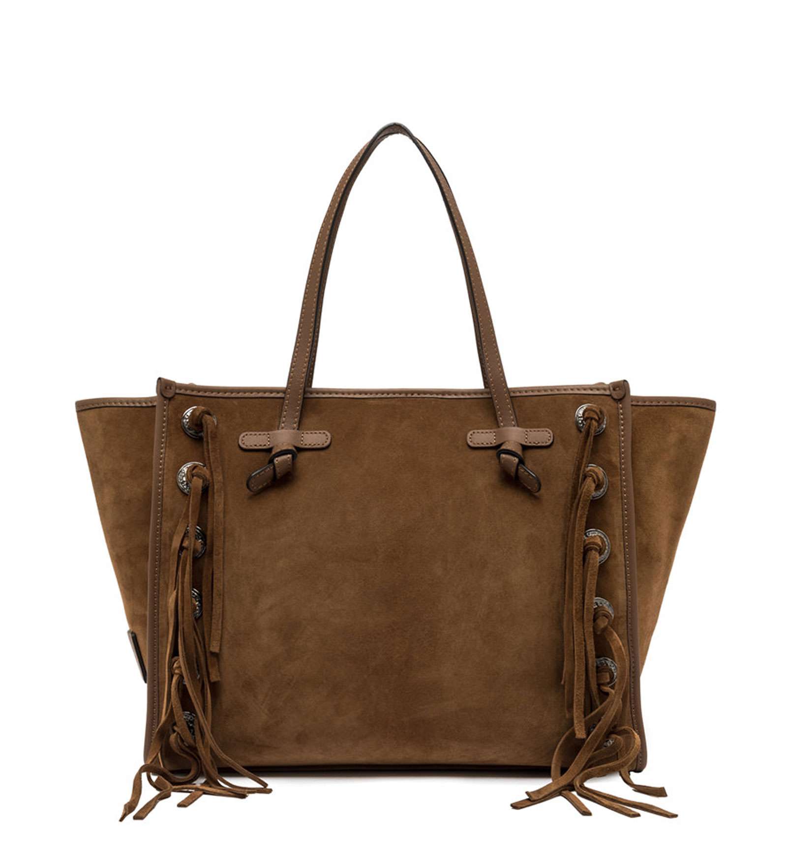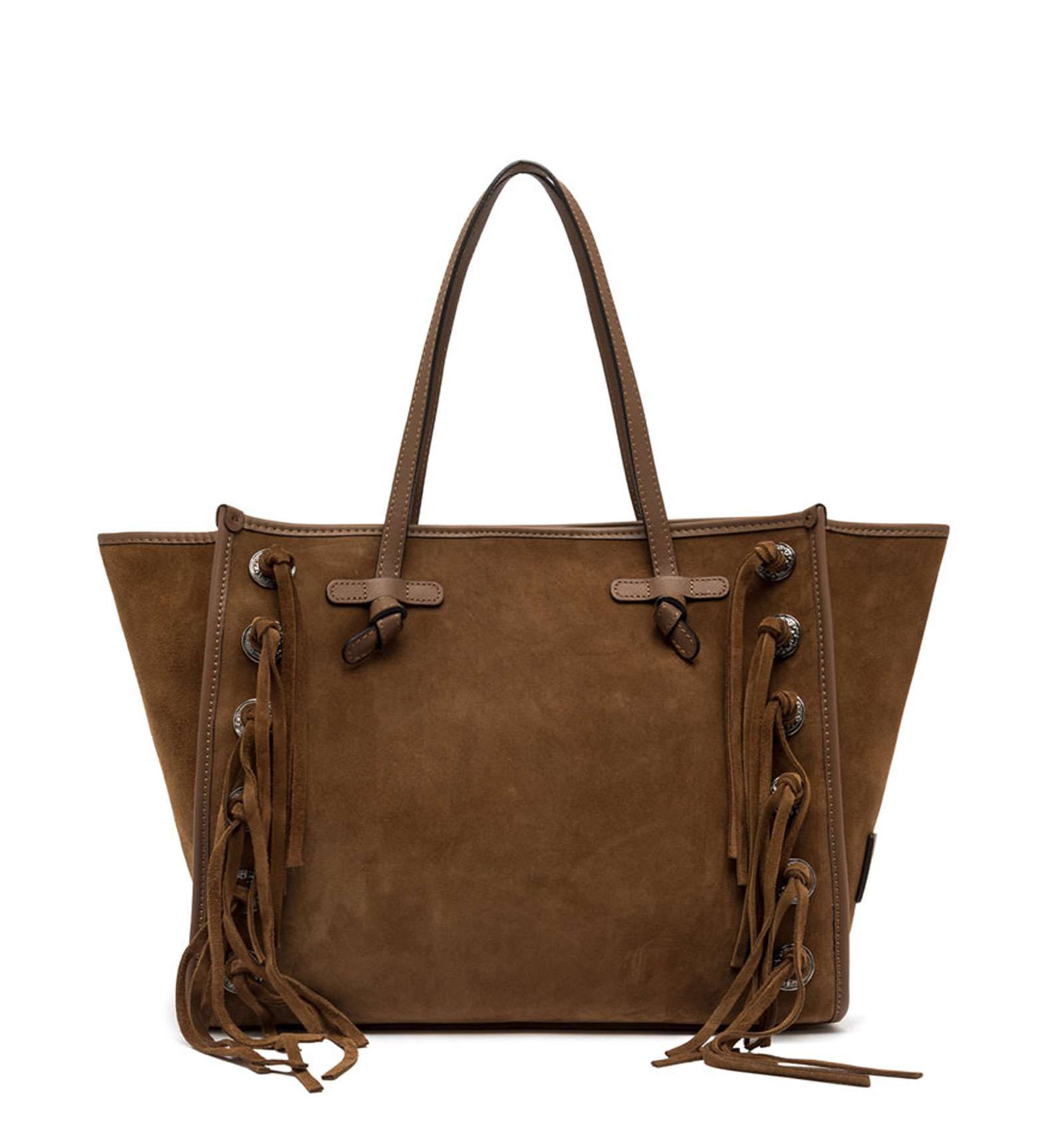 Marcella shopping bag by Gianni Chiarini Firenze is crafted from soft, silky suede leather, adorned with tone-on-tone leather fringes and studs. Perfect for everyday use, it features leather handles and a convenient magnetic clasp closure. It comes with leather profiles, which give the bag a stylish look. Size: 38x31x16 cm.