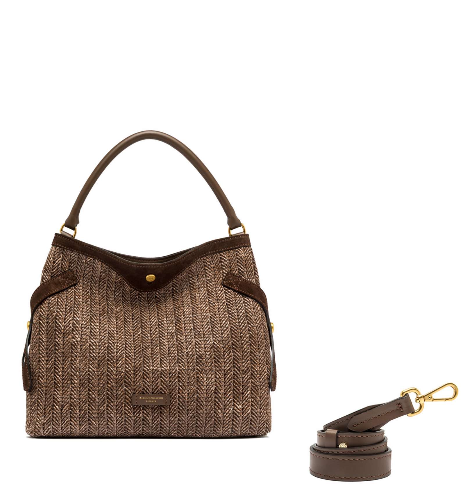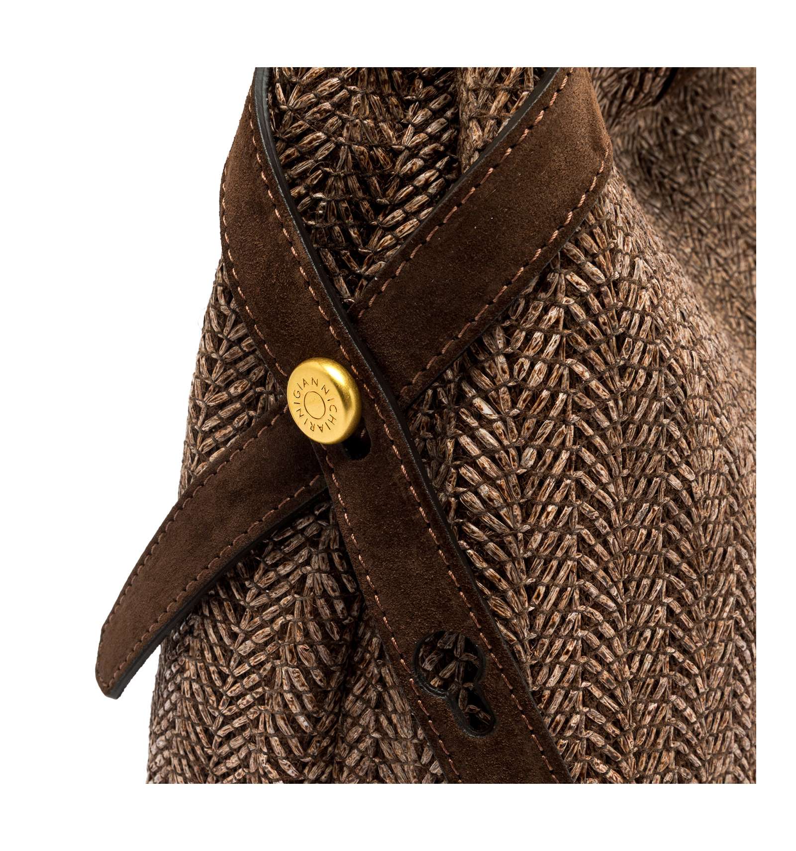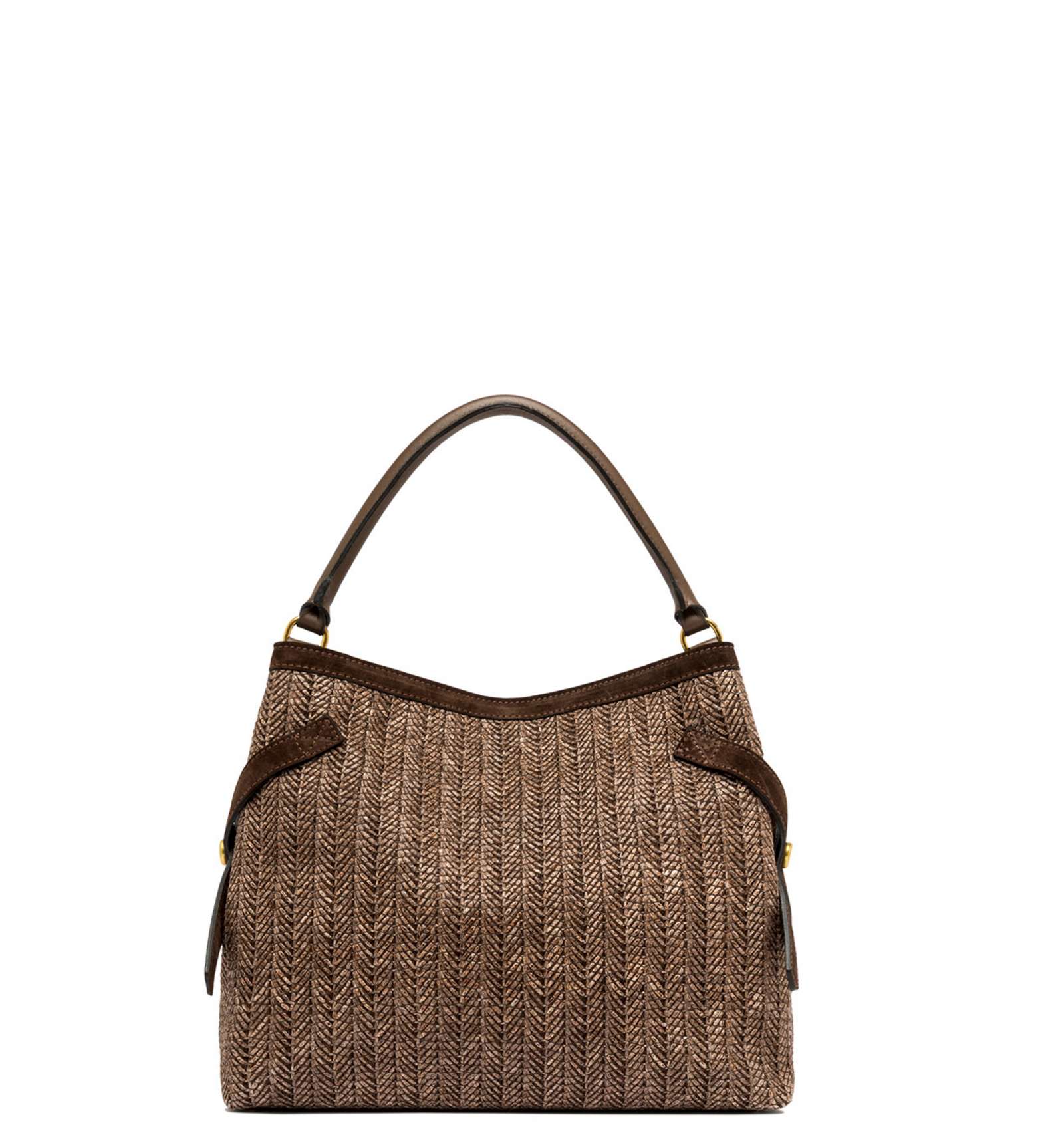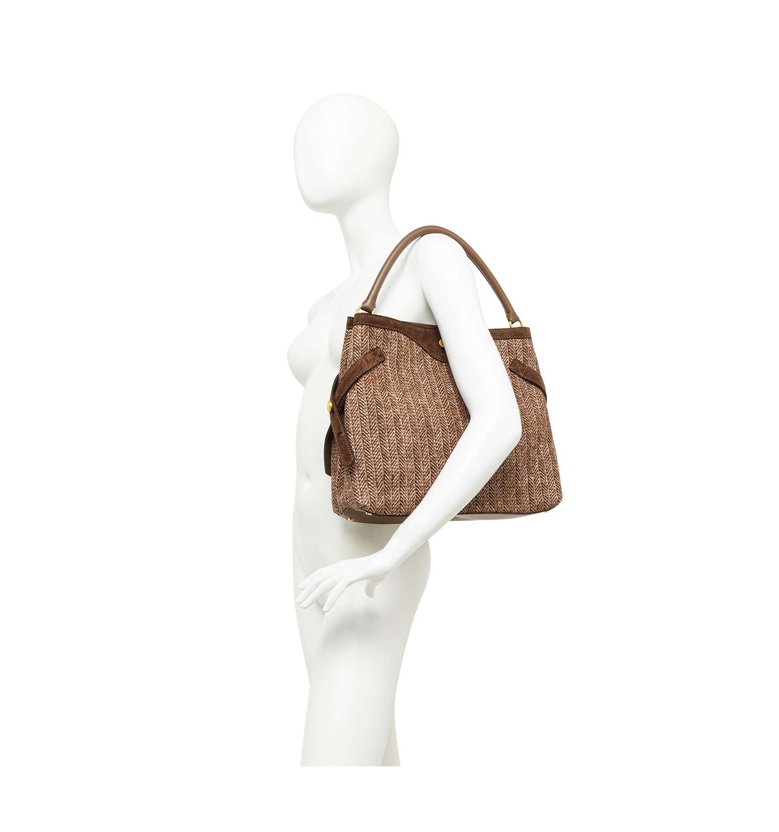Claudette is an elegant, versatile bag crafted from woven straw with suede trim, it channels rustic-chic charm while remaining perfectly functional. Metal details and signature logo cufflinks add distinctive flair, while the side ties lend fluidity to the silhouette. It offers two carrying options: by the leather handle or cross-body with the adjustable strap. Size: 35x30x13 cm.