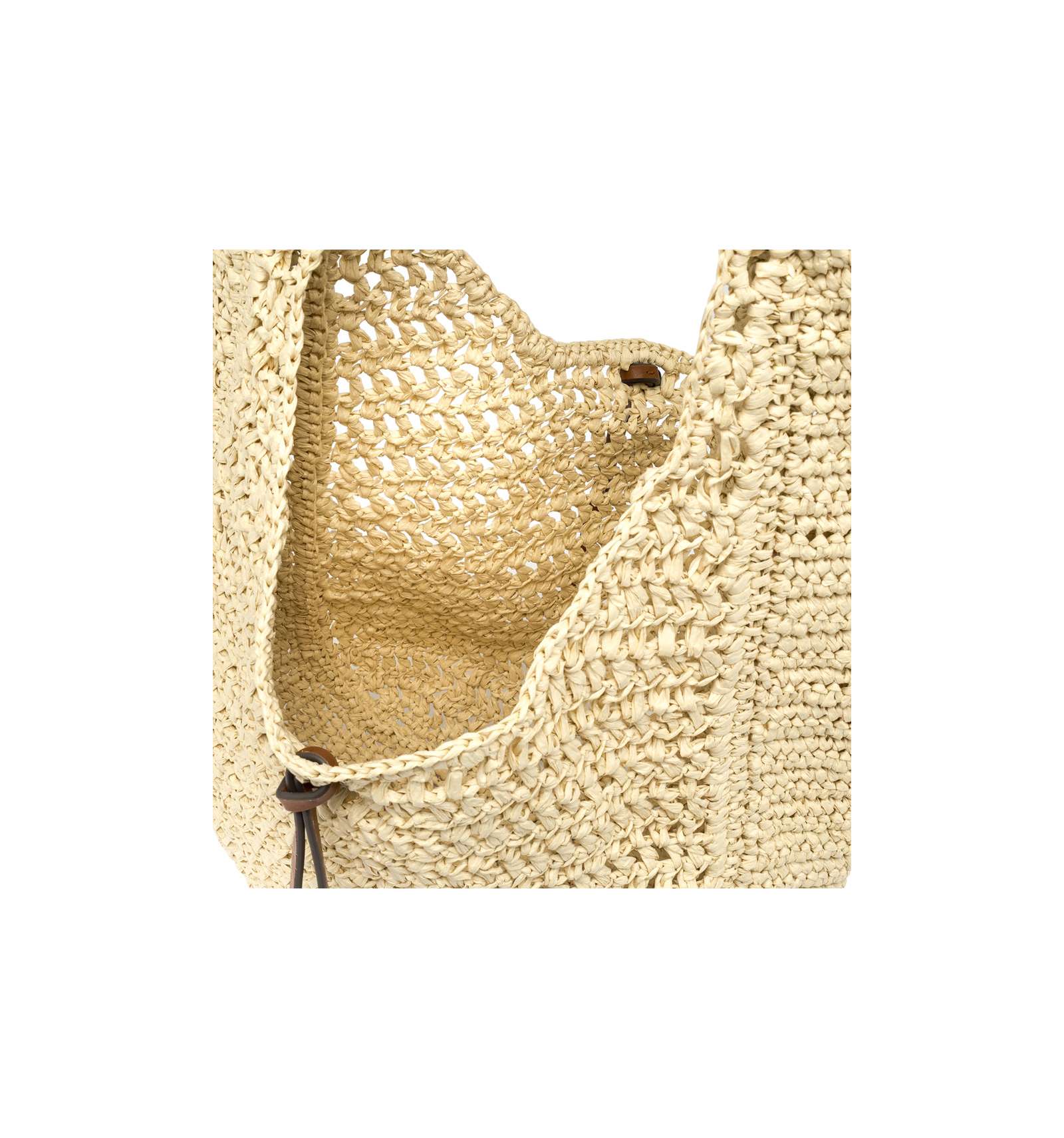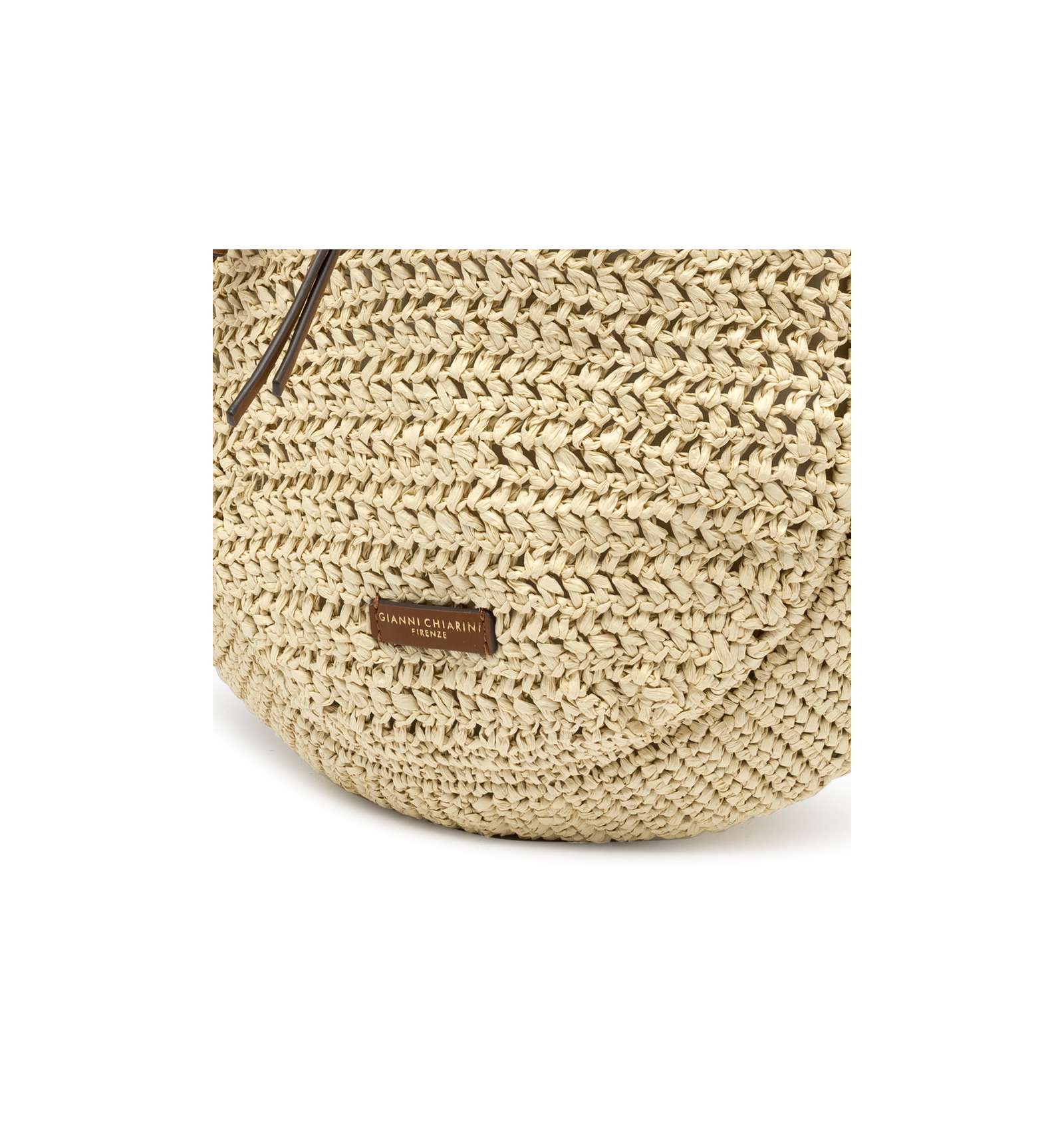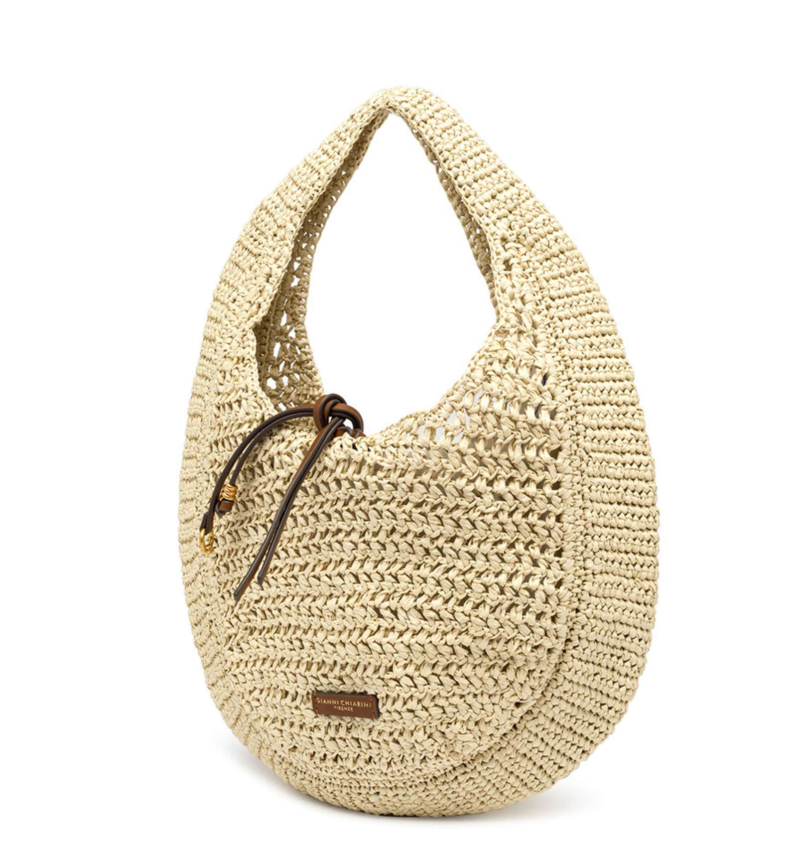Nefeli is the new hobo bag by Gianni Chiarini Firenze, made of crochet straw, perfect for breezy, stylish summer days. Features a drawstring closure and metal details that add a luminous touch to the design. Size: 32x27x9 cm.