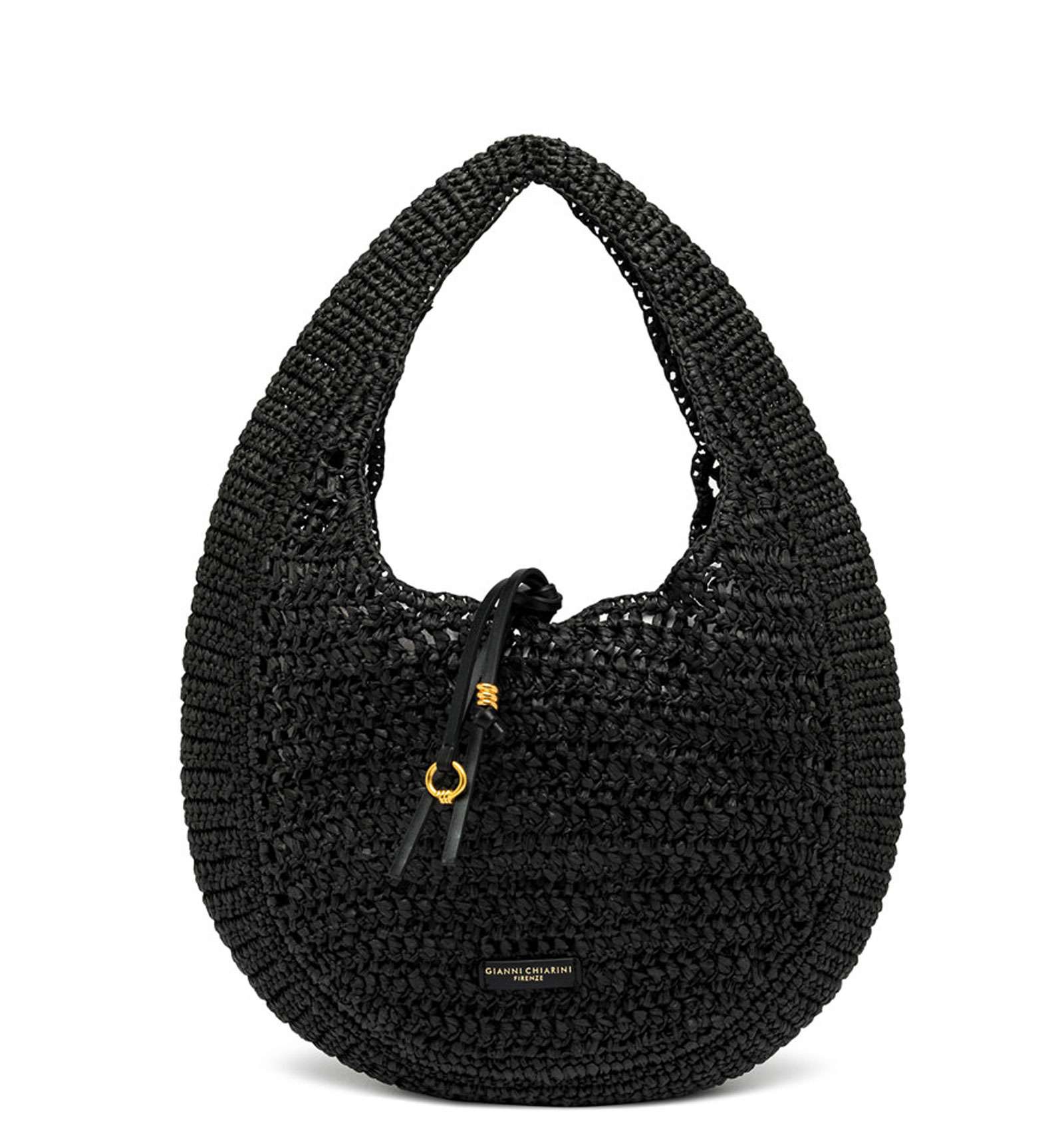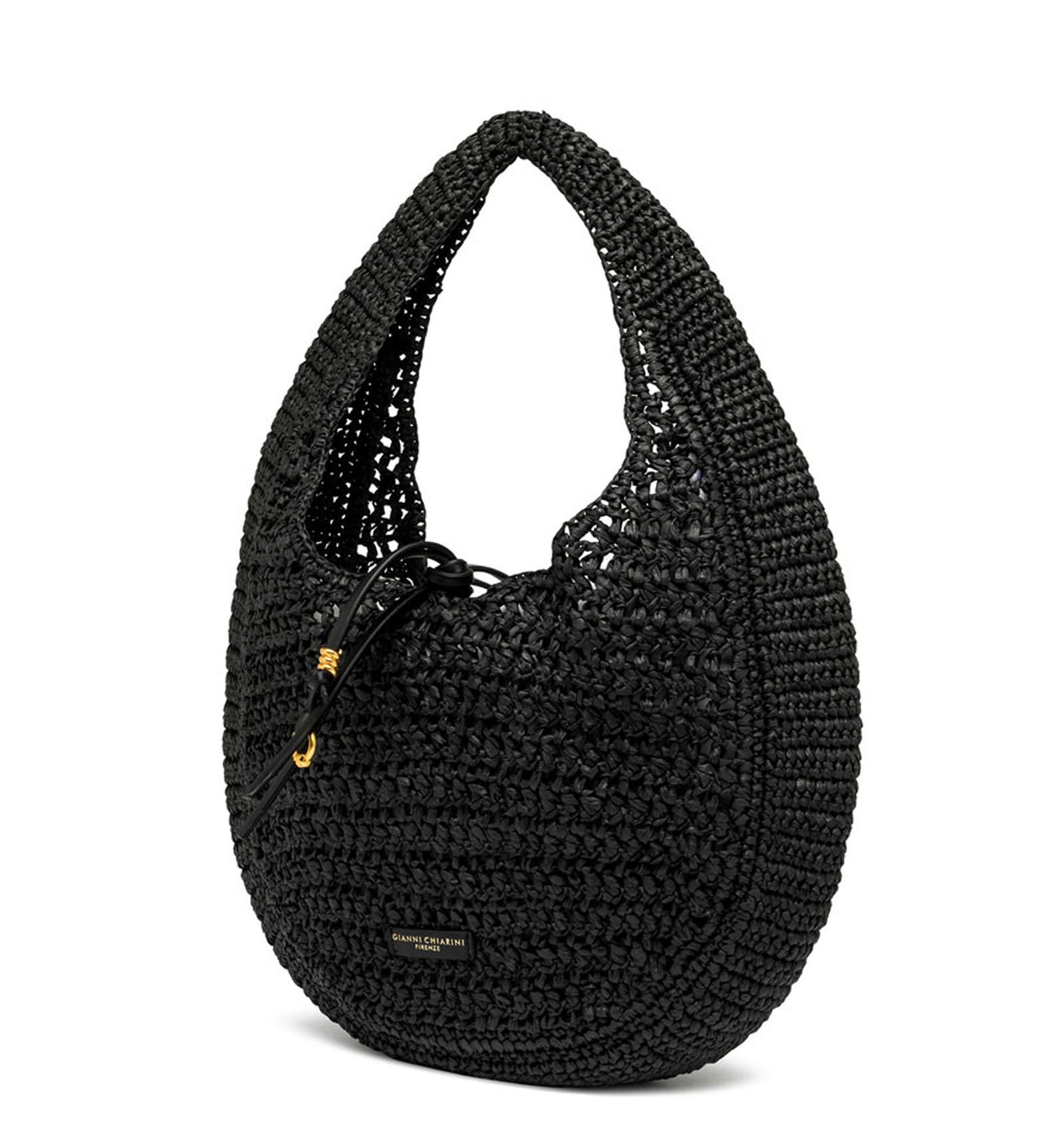 Nefeli is the new hobo bag by Gianni Chiarini Firenze, made of crochet straw, perfect for breezy, stylish summer days. Features a drawstring closure and metal details that add a luminous touch to the design. Size: 32x27x9 cm.