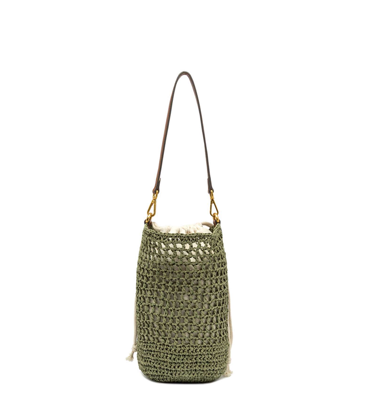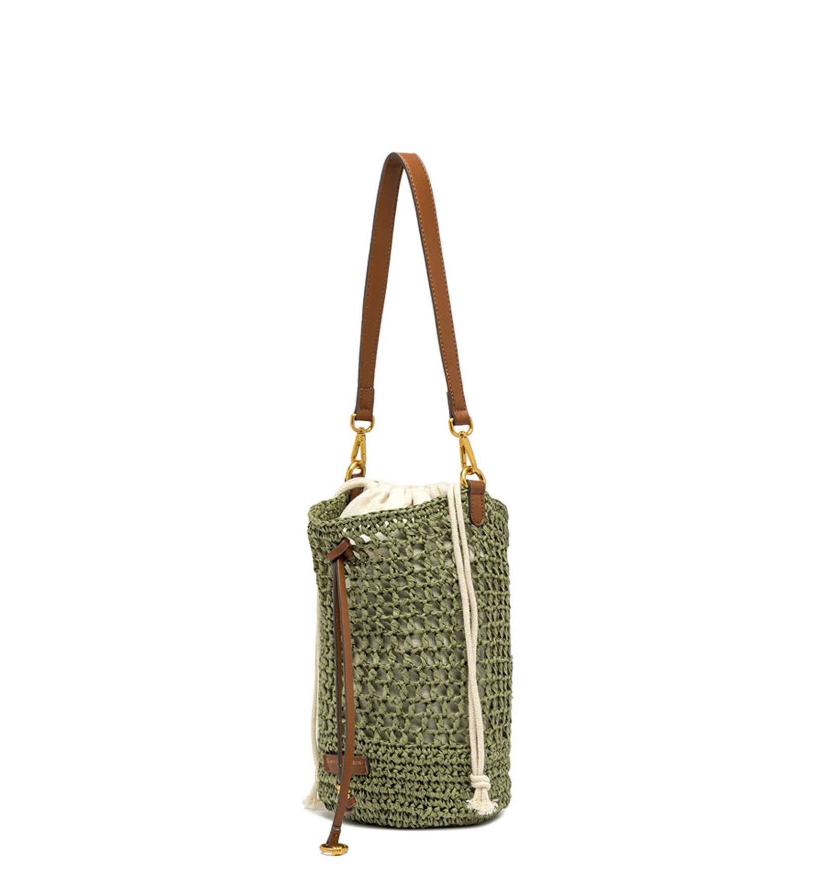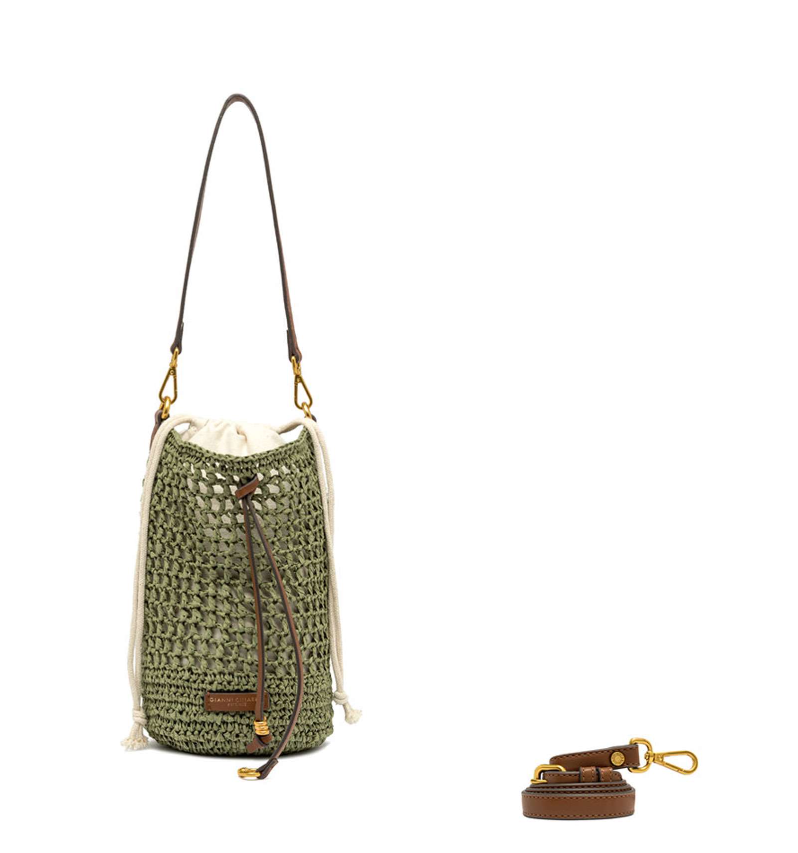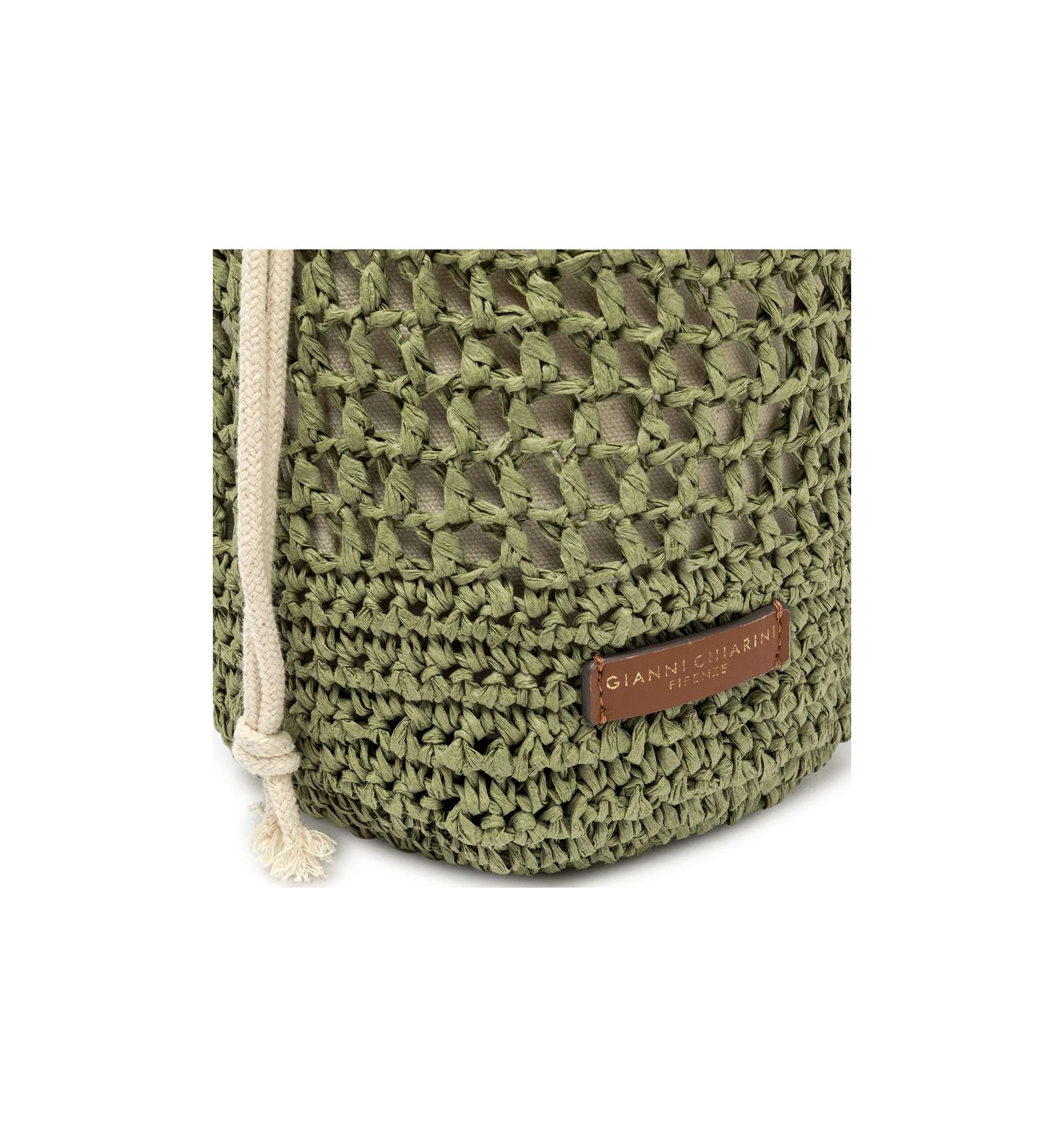 Nefeli is the new bucket bag by Gianni Chiarini Firenze, made of crochet straw, perfect for breezy, stylish summer days. Features a drawstring closure and metal details that add a luminous touch to the design. Equipped with a practical, removable strap for versatile wear. Size: 16x27x16 cm.