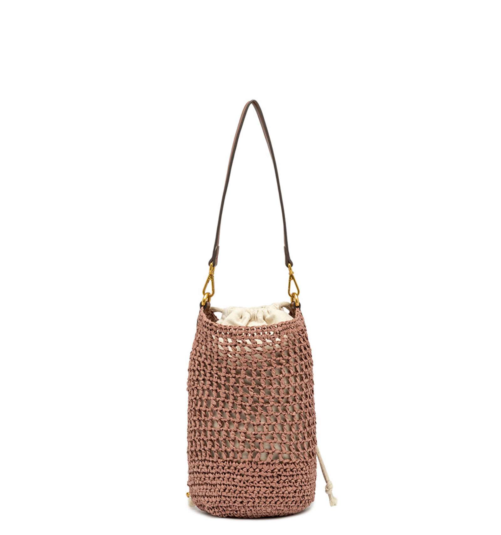 Nefeli is the new bucket bag by Gianni Chiarini Firenze, made of crochet straw, perfect for breezy, stylish summer days. Features a drawstring closure and metal details that add a luminous touch to the design. Equipped with a practical, removable strap for versatile wear. Size: 16x27x16 cm.