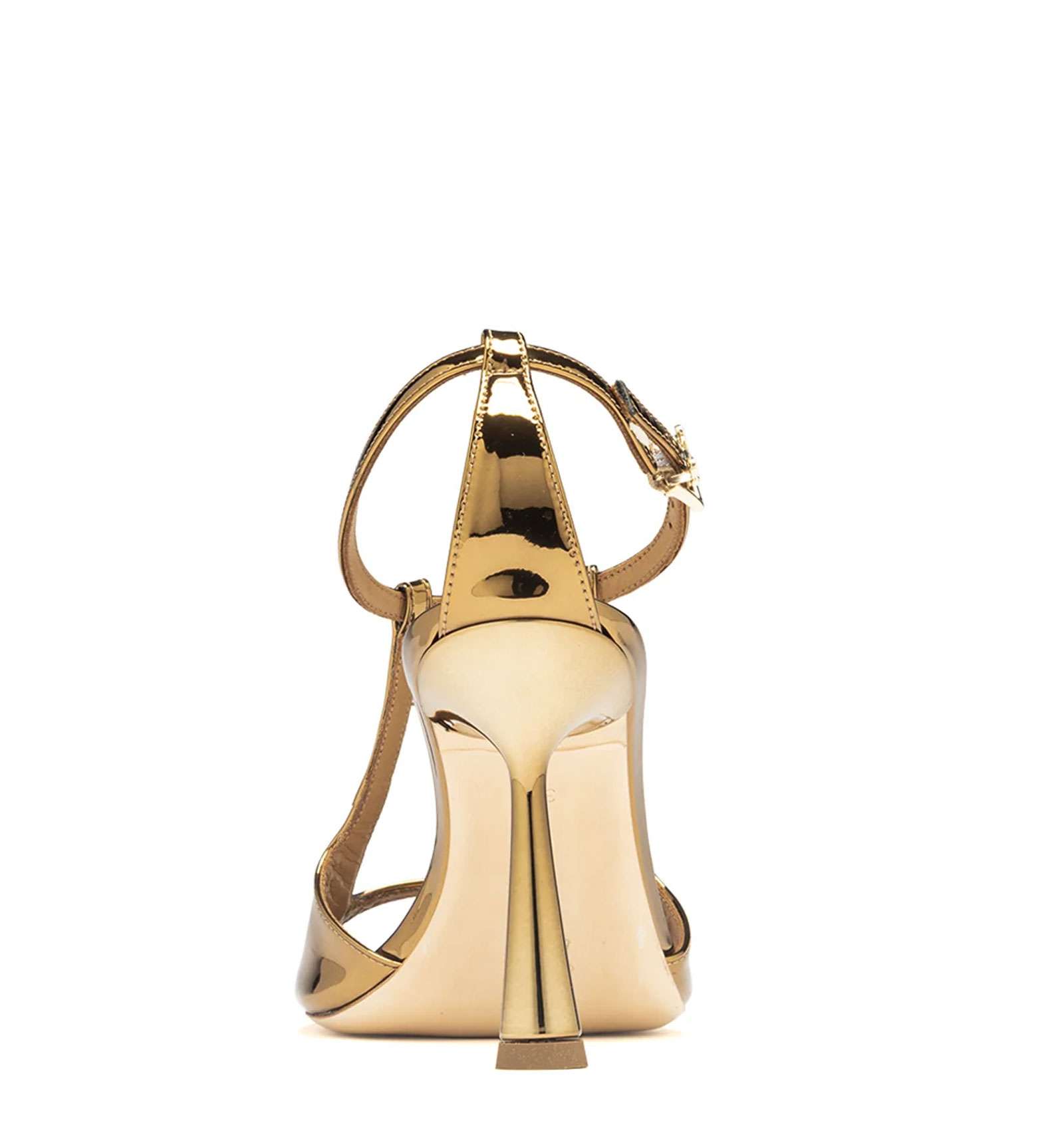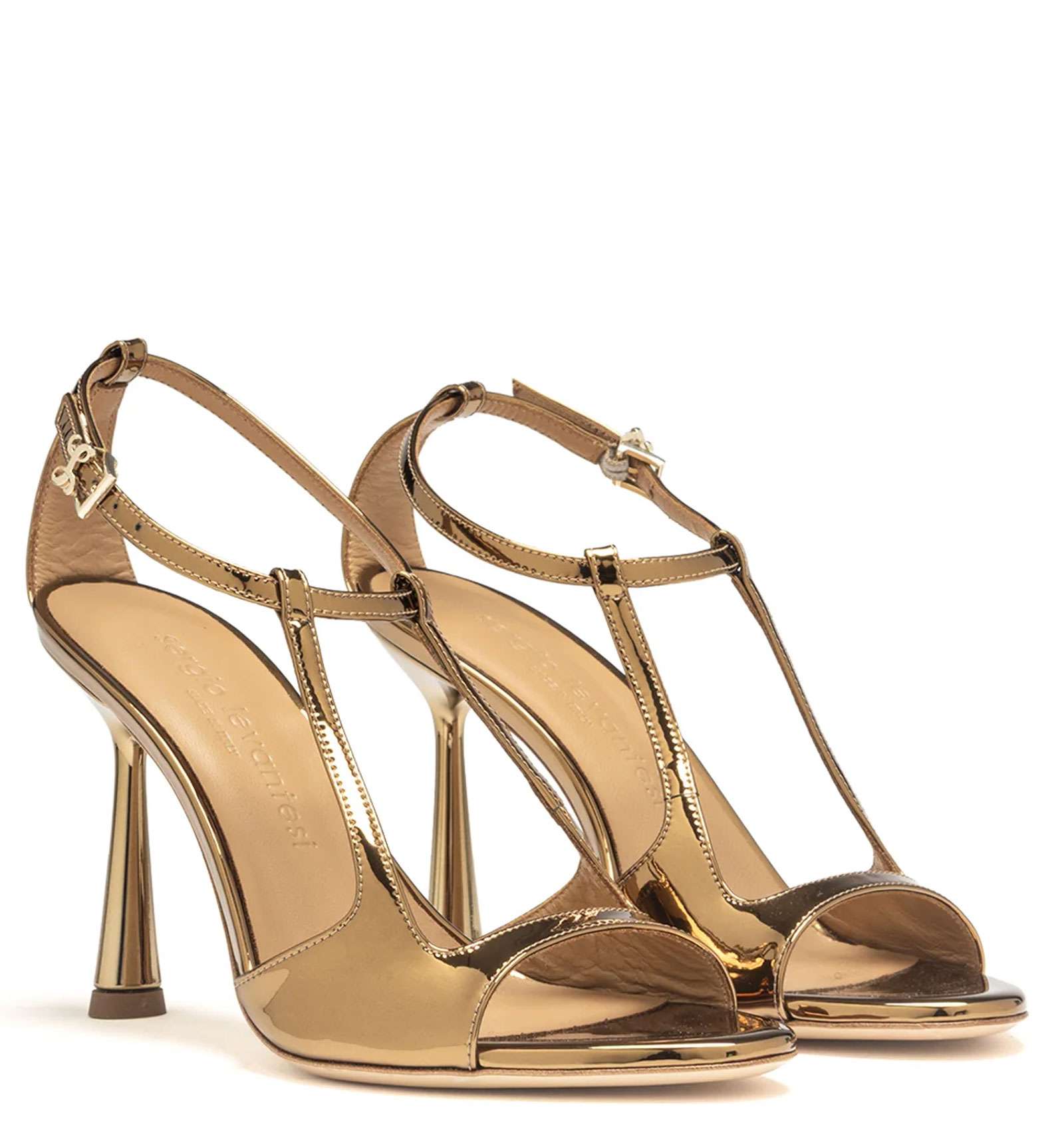 Elegant sandal with a 90 mm heel. Made from leather and eco-leather, it adds shine to every step with a stable fit thanks to the leather sole with a half-rubber insert. Handmade in Italy.