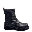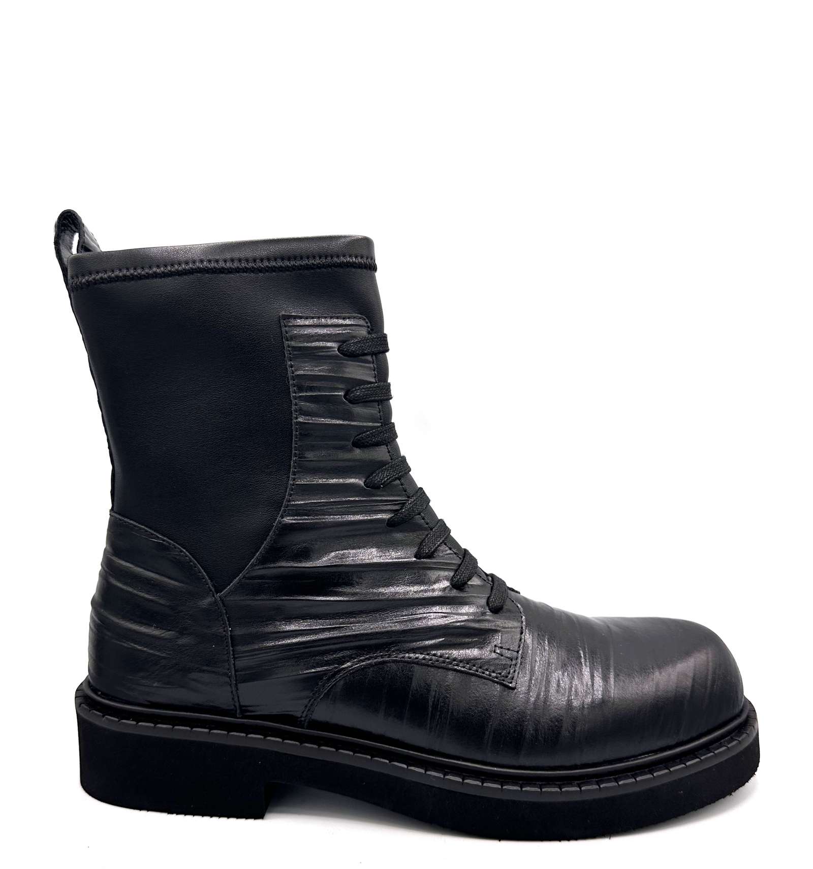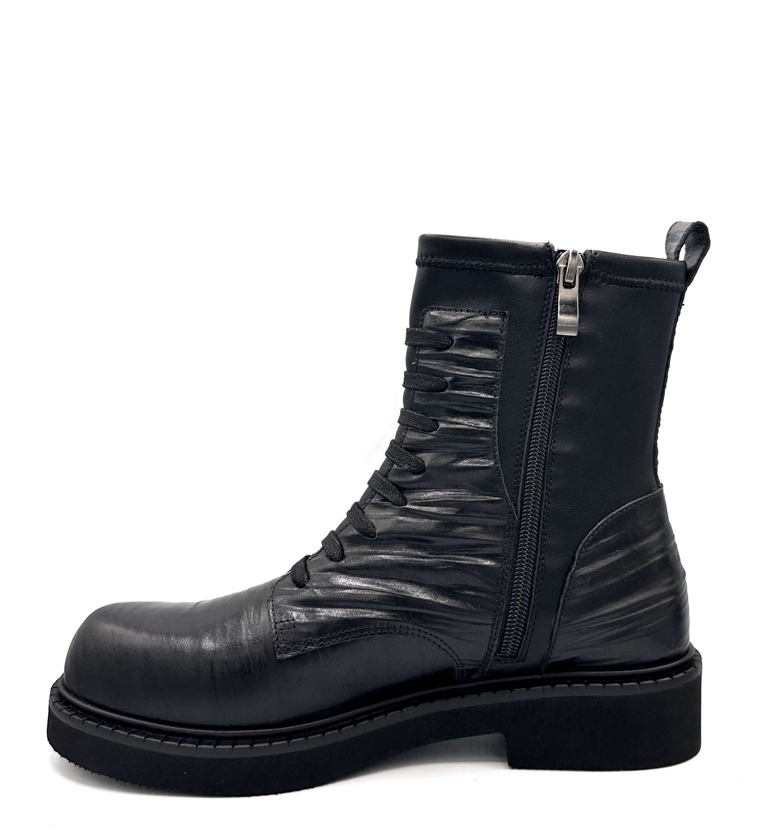 Anfibio in pelle nera con effetto plissè, dotato di cerniera laterale.