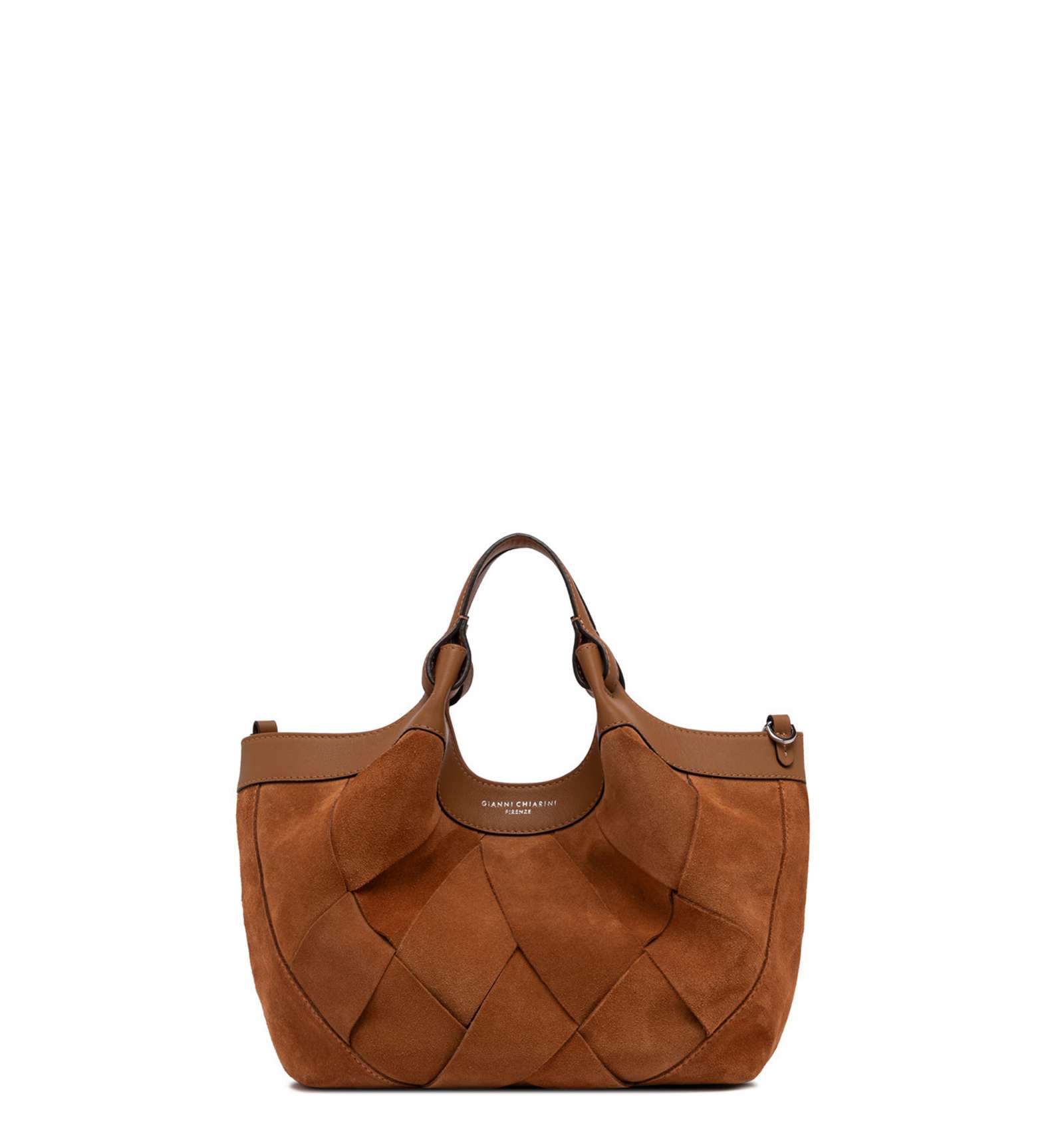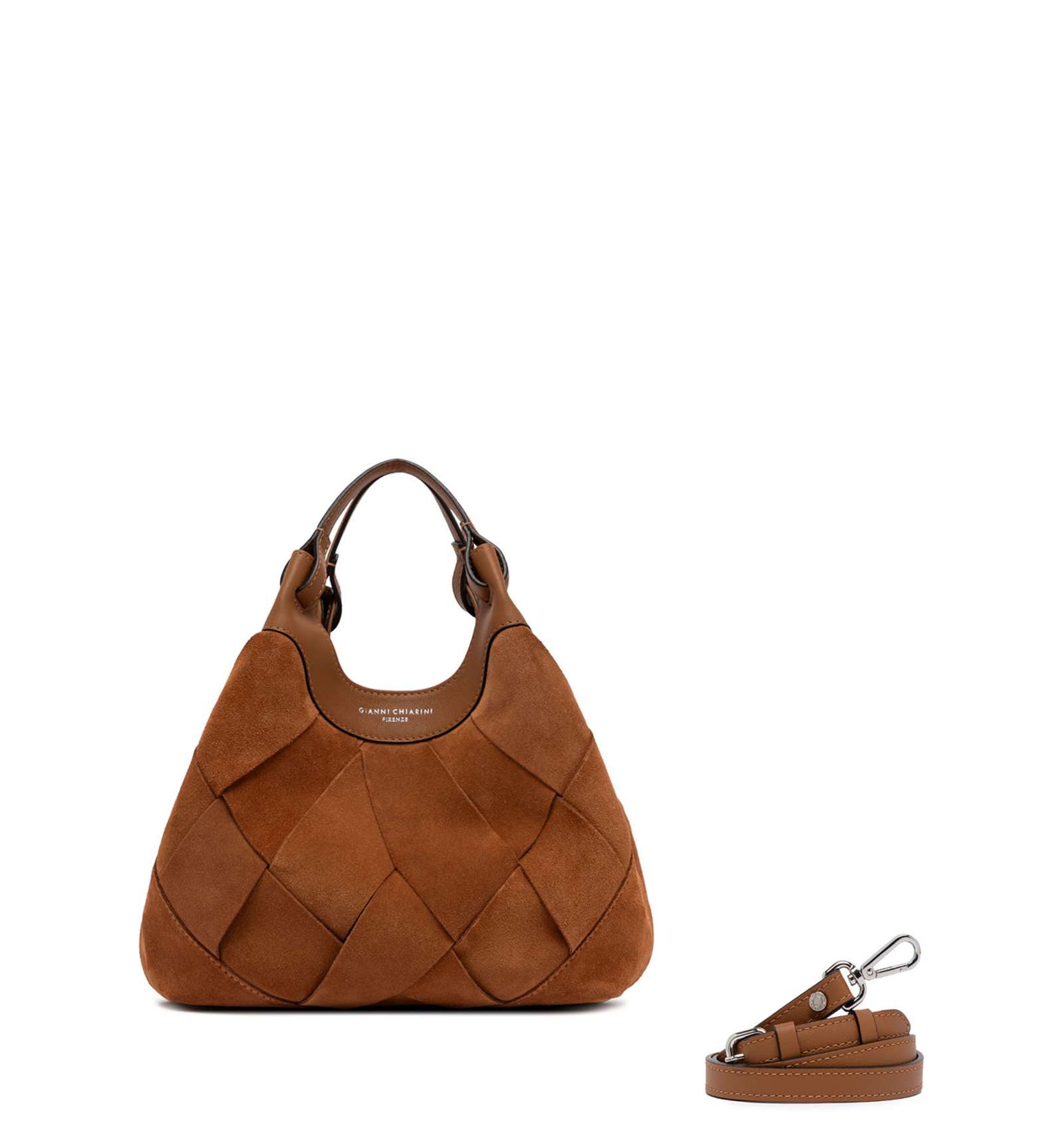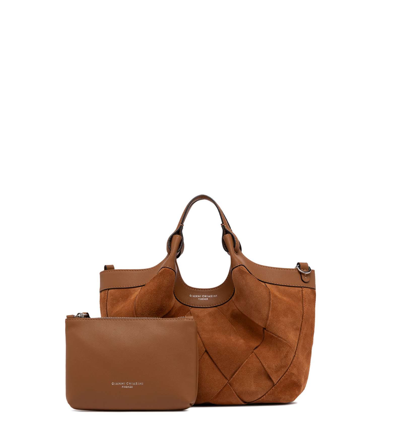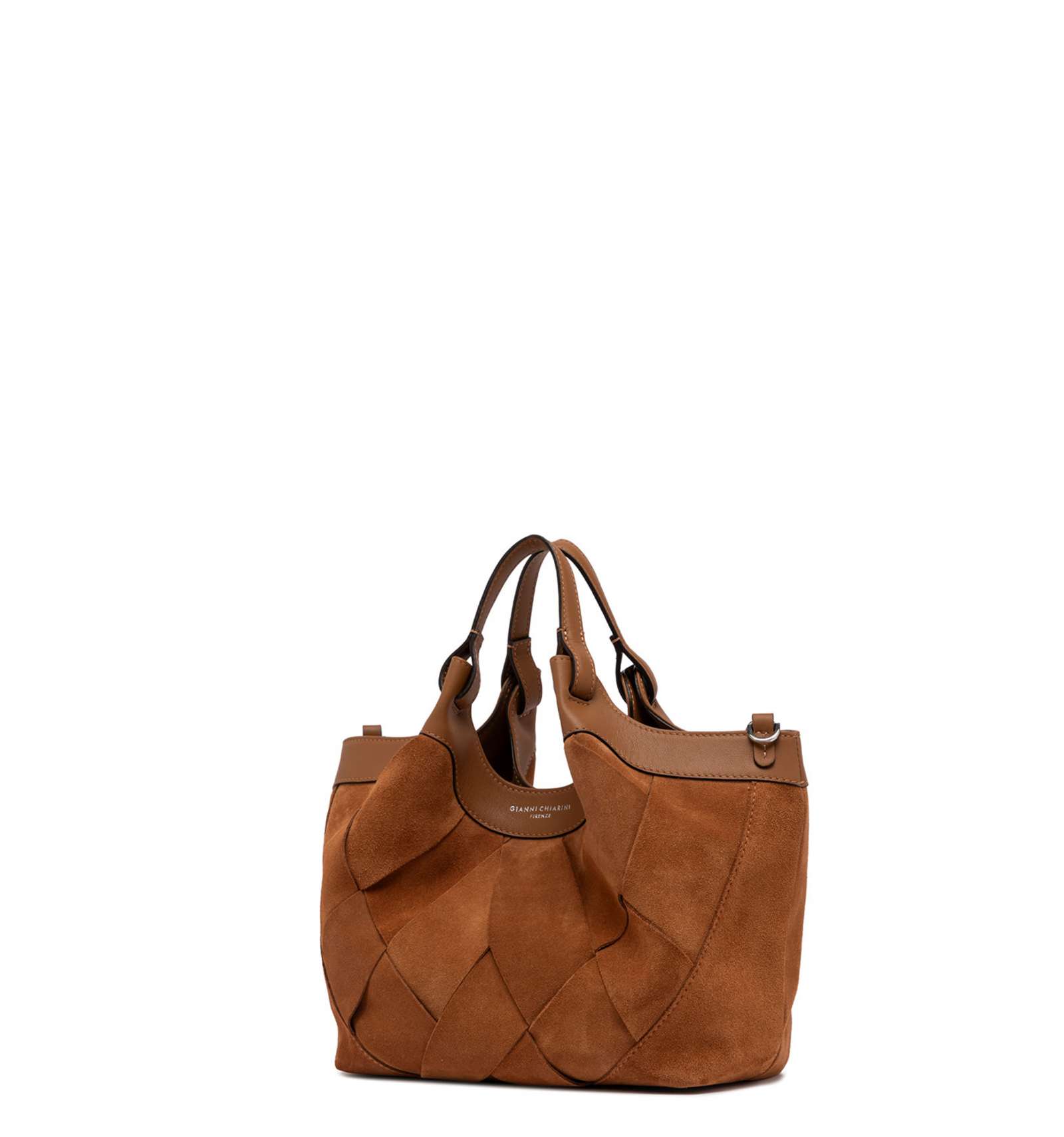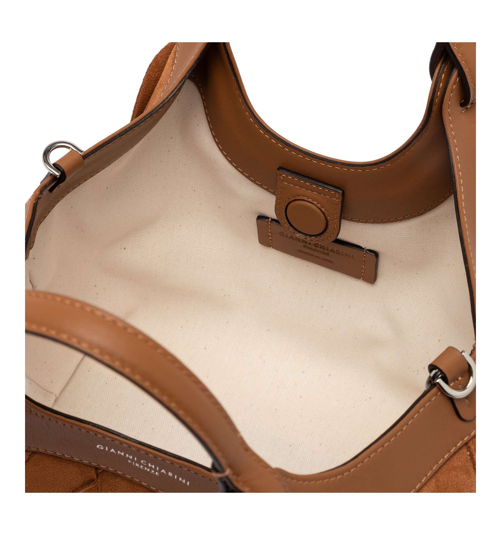 DUA è l'icona del brand, una borsa dal design semplice ma contemporaneo. Realizzata in pelle di camoscio con trama geometrica, si distingue per il suo stile country-chic che la rende un must-have di stagione. I profili in pelle esaltano la naturalezza dei suoi colori, mentre la lavorazione della trama aggiunge carattere e raffinatezza. Dotata di un monoscomparto e doppi manici in tono, si chiude con un bottone a pressione. Può essere portata a mano o crossbody grazie alla tracolla inclusa.