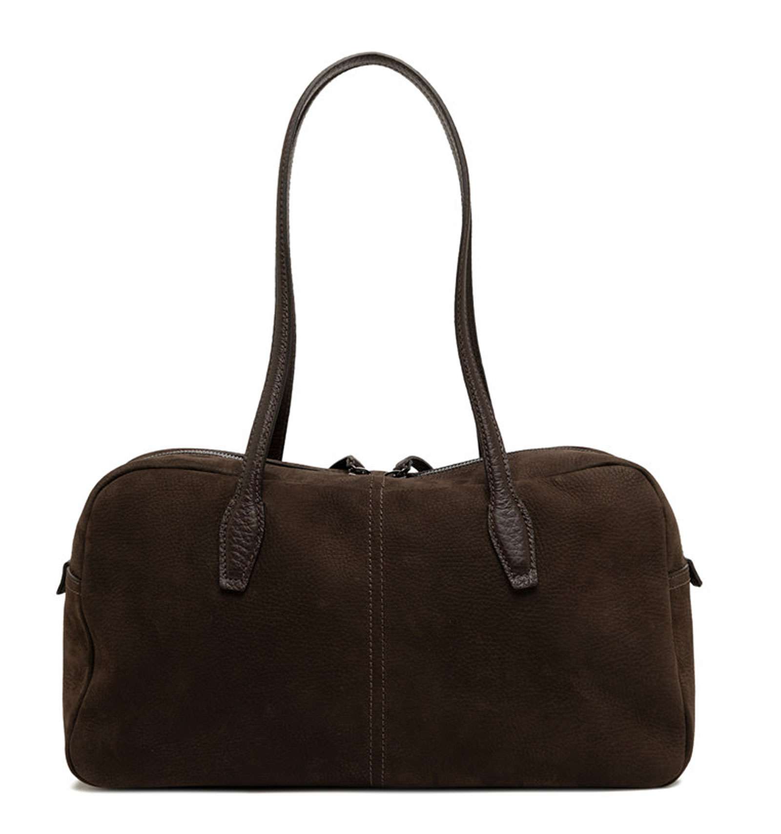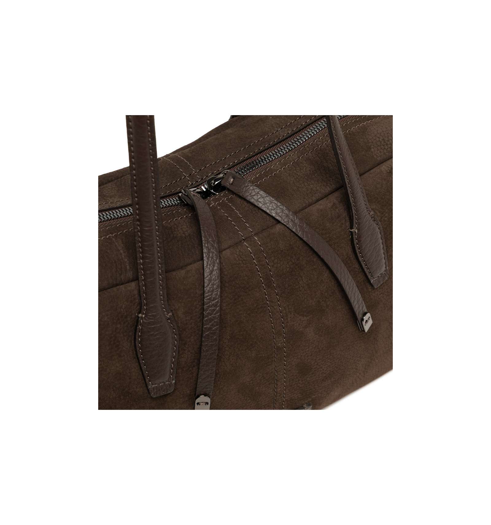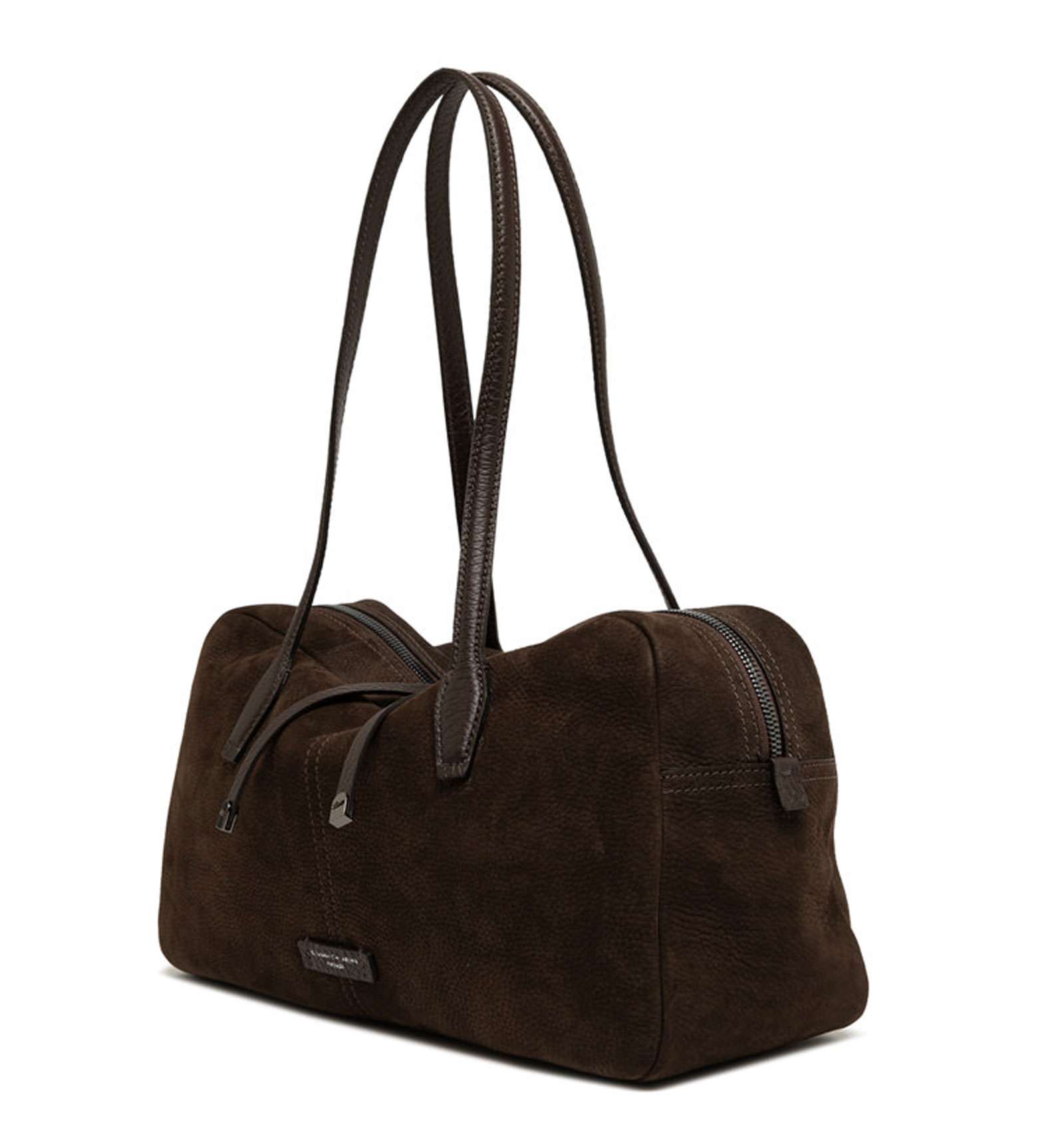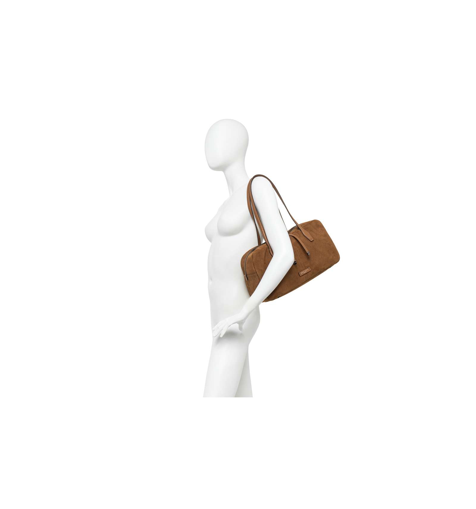 Aryna è la nuova borsa a mano, in pelle nabuk, l'accessorio ideale per una donna sportiva dallo stile disinvolto, ma femminile. Presenta uno scomparto principale con zip doppio cursore e tirazip in metallo. I rivetti logati arricchiscono il design, mentre i due manici superiori offrono una portabilità handle.