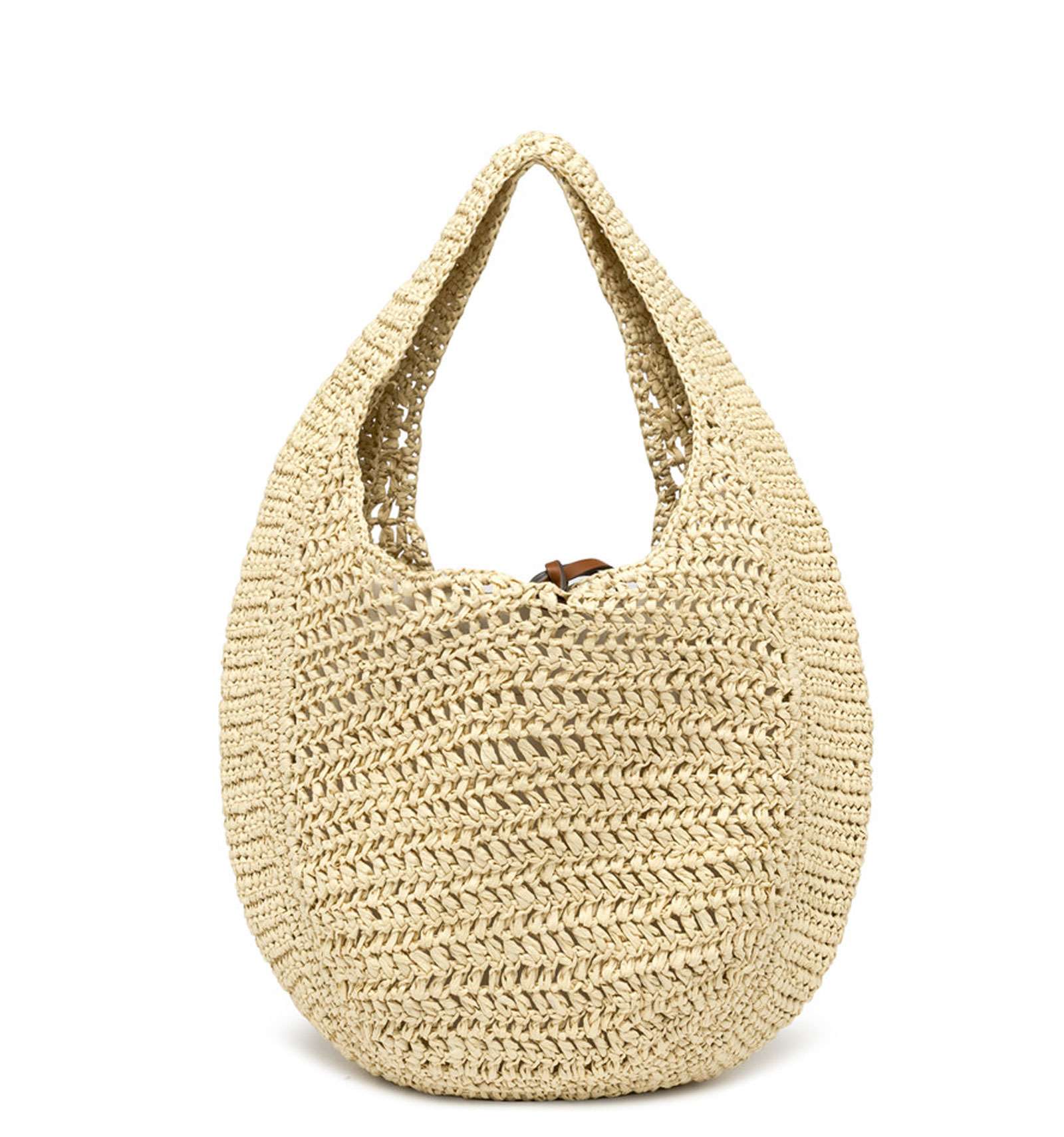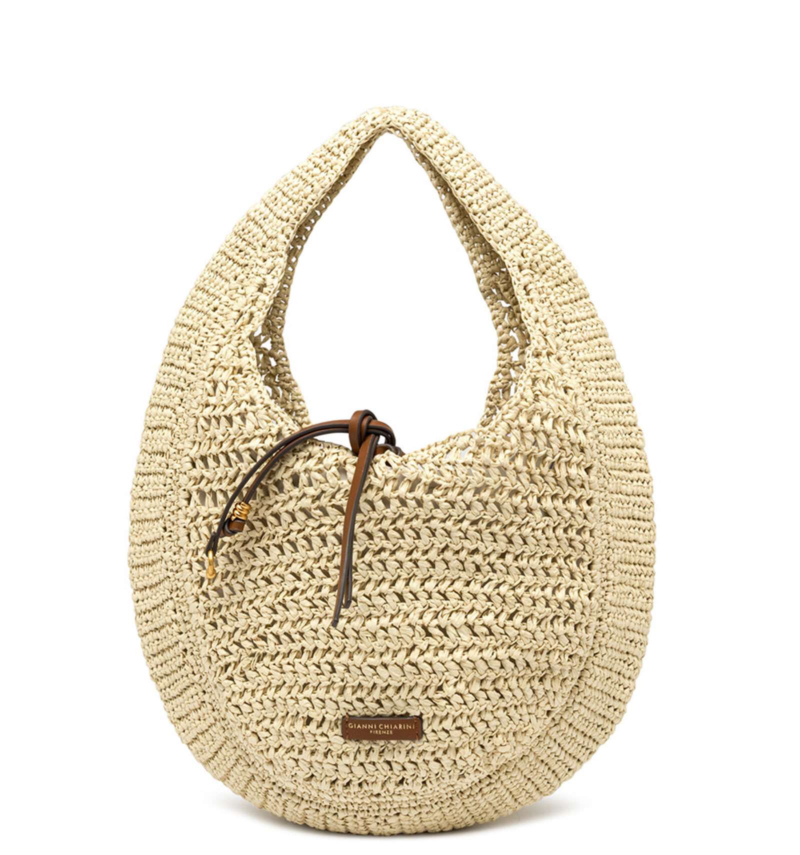 Nefeli è la nuova borsa hobo di Gianni Chiarini Firenze, realizzata in paglia crochet, perfetta per affrontare con leggerezza e stile le giornate estive. Presenta una chiusura con cordoncino e dettagli in metallo che donano un tocco luminoso al design. Dimensioni: 32x27x9 cm.