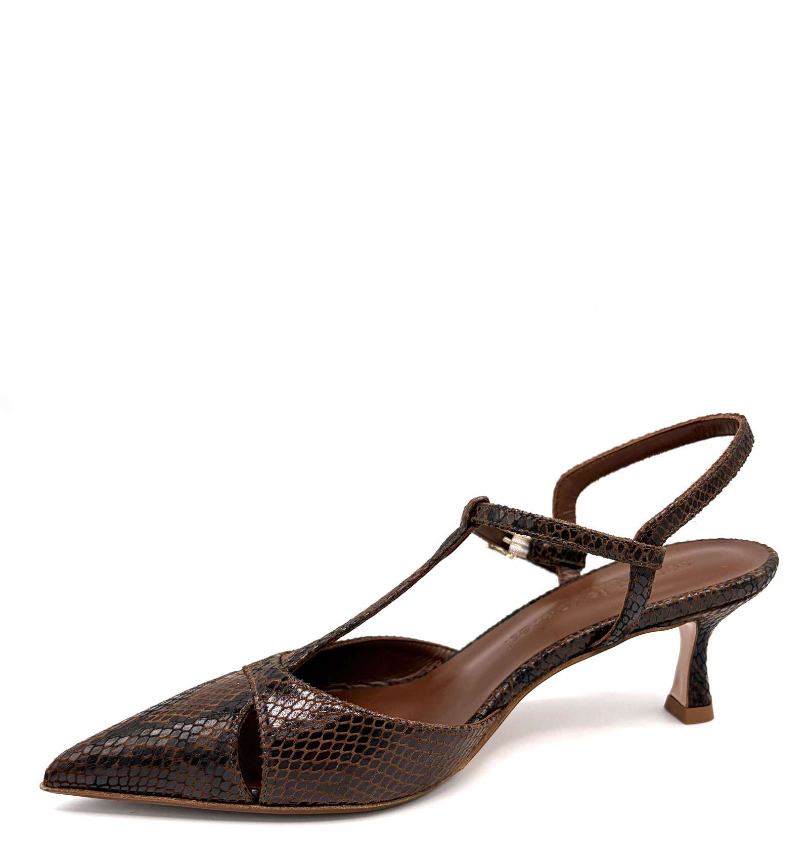 Slingback elegante con un tacco da 50 mm. Realizzata in pelle ed ecopelle, definisce lo stile con carattere e una calzata stabile grazie alla suola in cuoio e mezza gomma. Fatto a mano in Italia.