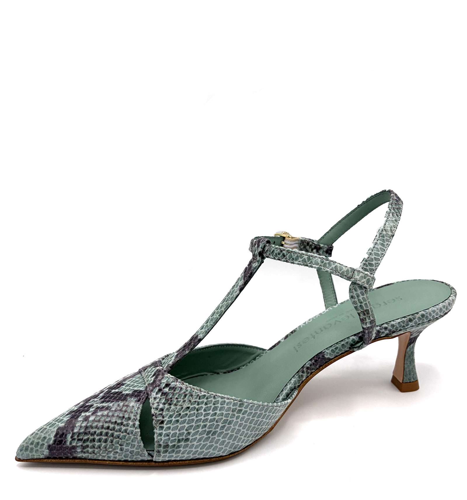 Slingback elegante con un tacco da 50 mm. Realizzata in pelle ed ecopelle, definisce lo stile con carattere e una calzata stabile grazie alla suola in cuoio e mezza gomma. Fatto a mano in Italia.