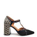 Decolletè in camoscio di colore nero con effetto leggermente luminoso con dettagli in vernice e tacco in pelle serigrafata color nero e beige.
