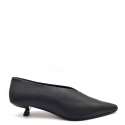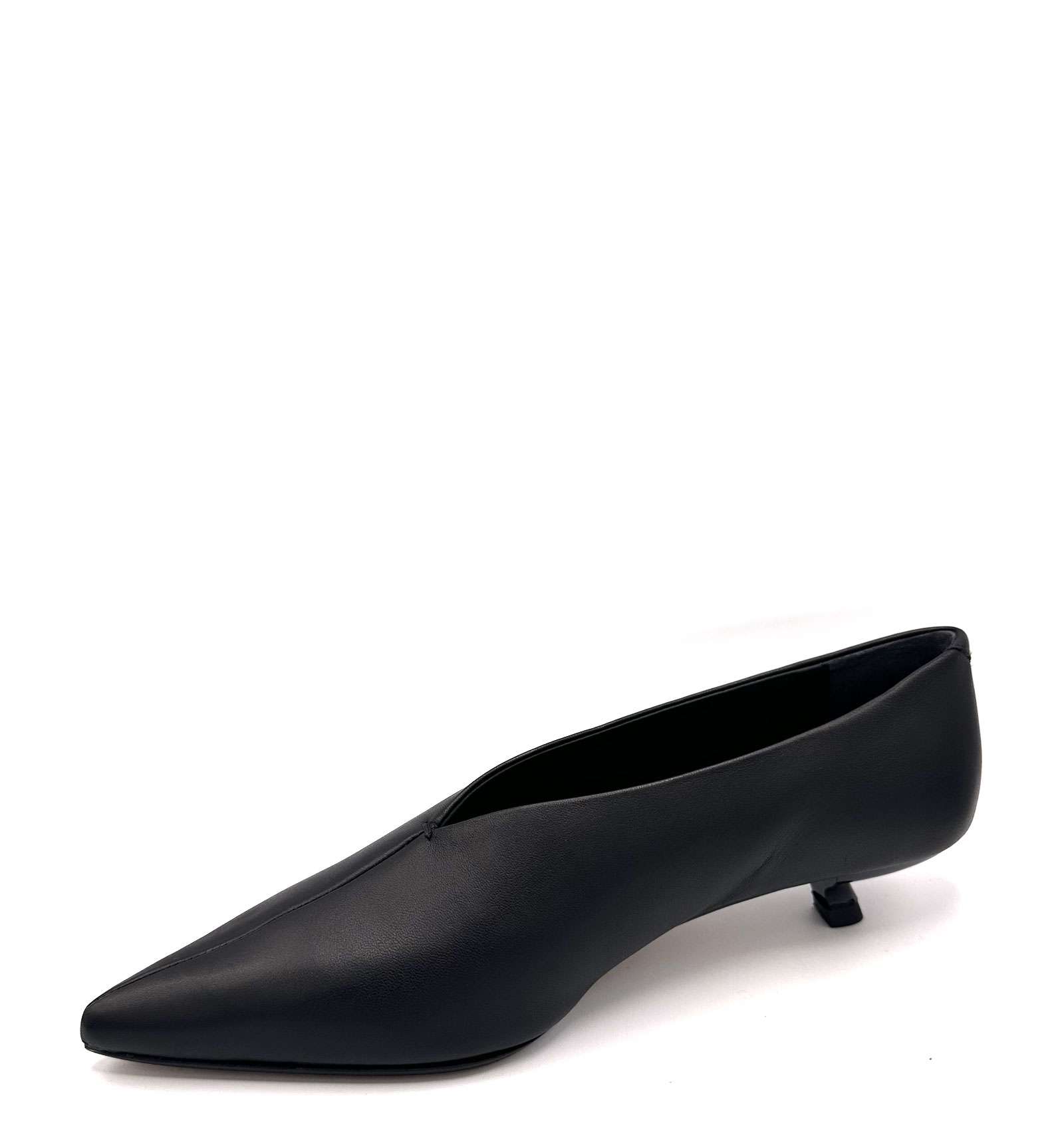Tronchetto in vera pelle liscia color nero, fondo in vera pelle, cerniera sul retro, tacco laccato lucido. Altezza tacco 3 cm.