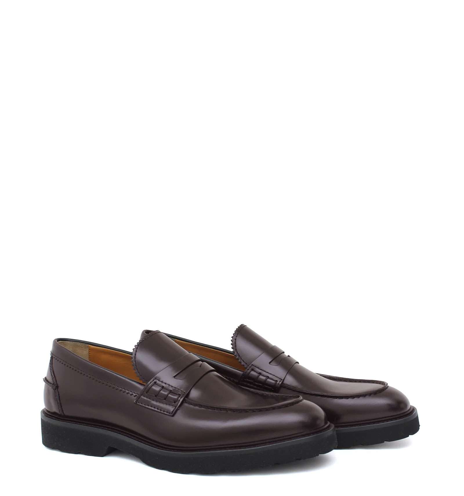 Mocassino college lavorazione ago, tomaia in vitello spazzolato semilucido color nero, fodera in vitello color cuoio, fondo in gomma roccia leggera e sottopiede comfort estraibile