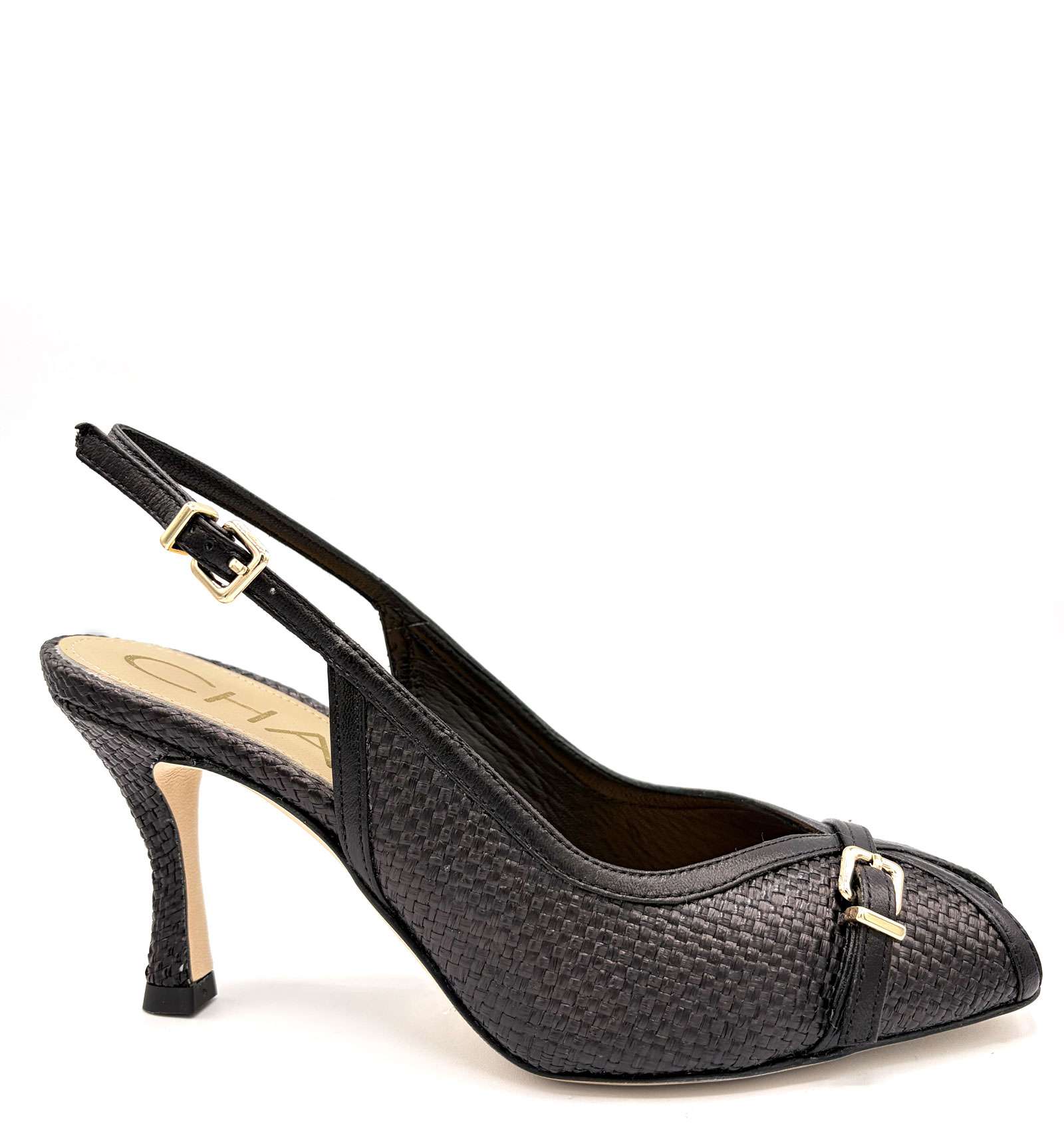 Slingback spuntato CHANTAL in raffia nero, altezza di tacco 70 mm.