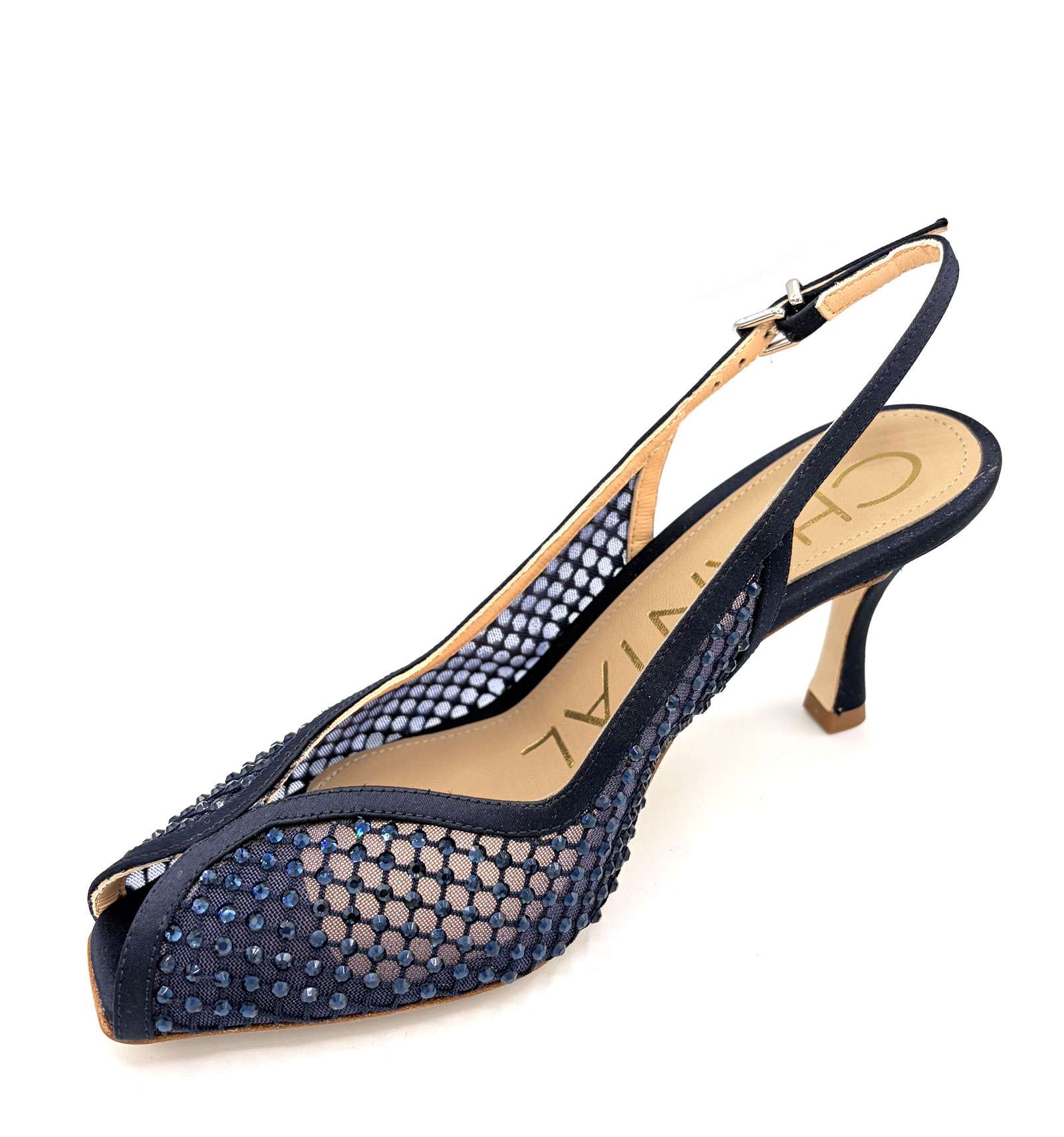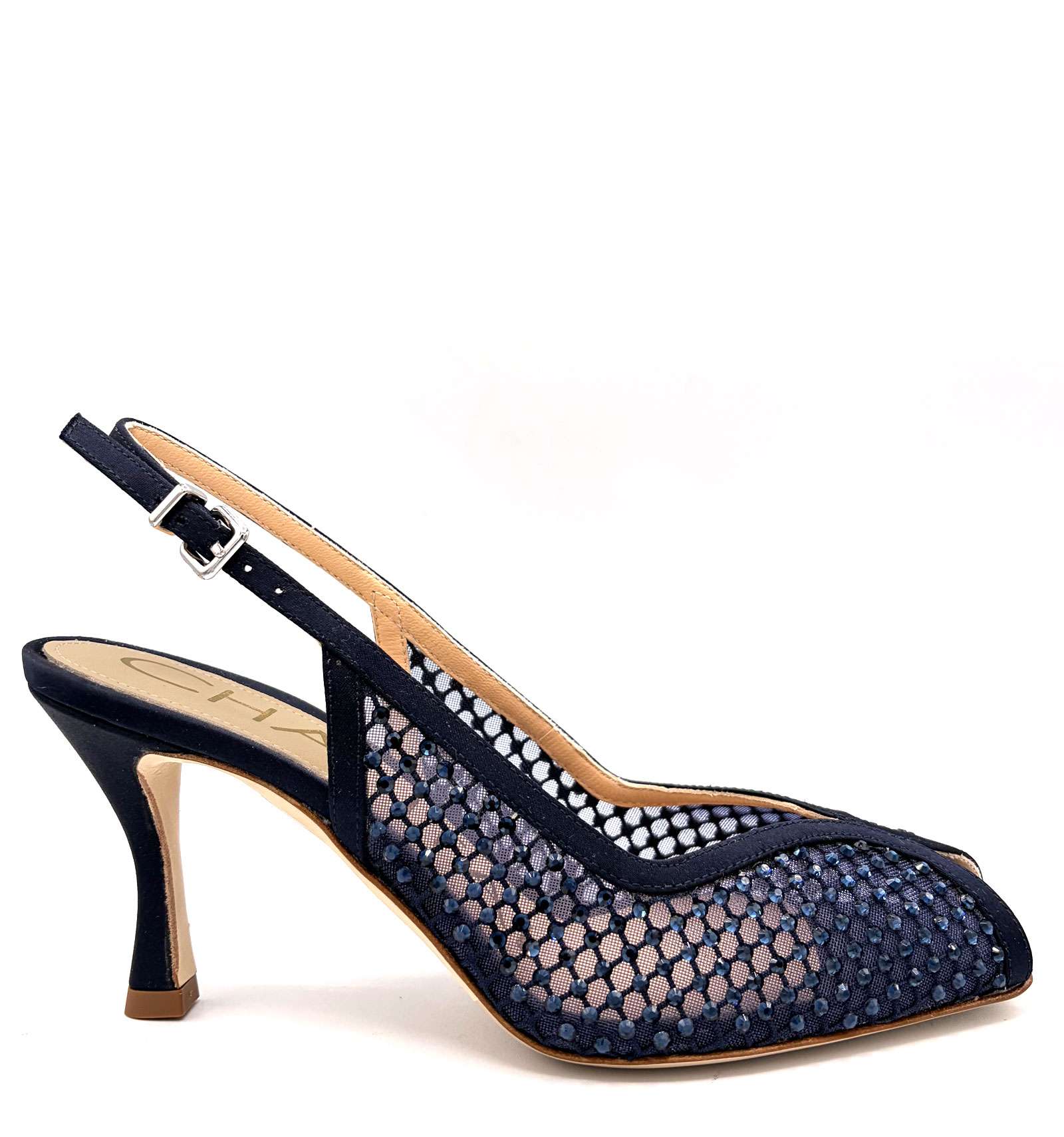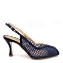 Slingback spuntato CHANTAL in raso nude in rete con swarovski tono su tono. Altezza tacco 70 mm.