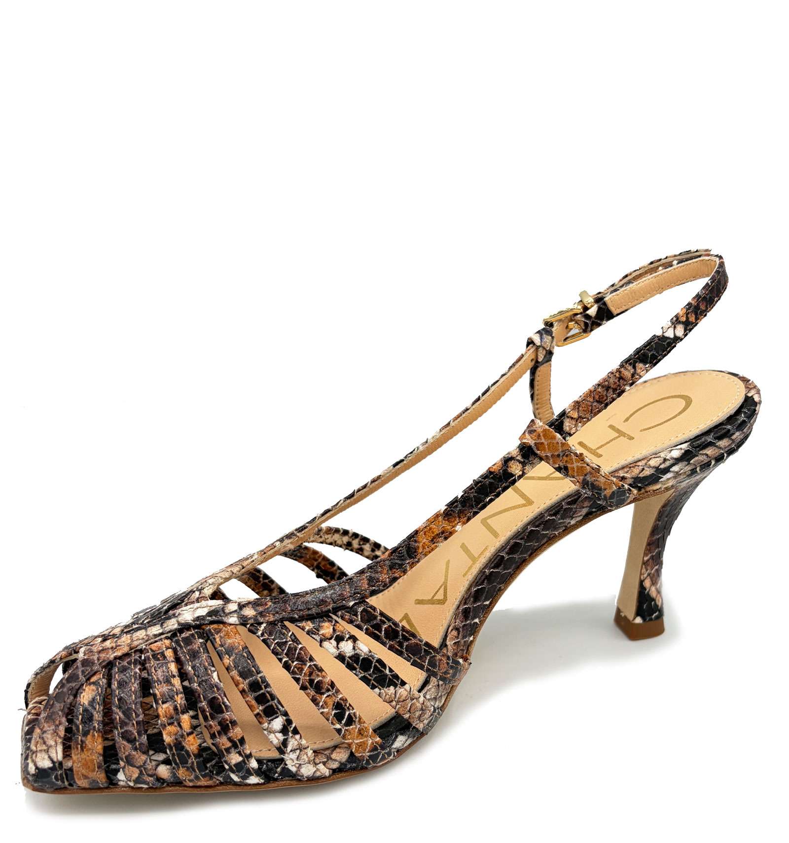 Slingback spuntato di CHANTAL realizzato in pitone cuoio, altezza tacco 70 mm.