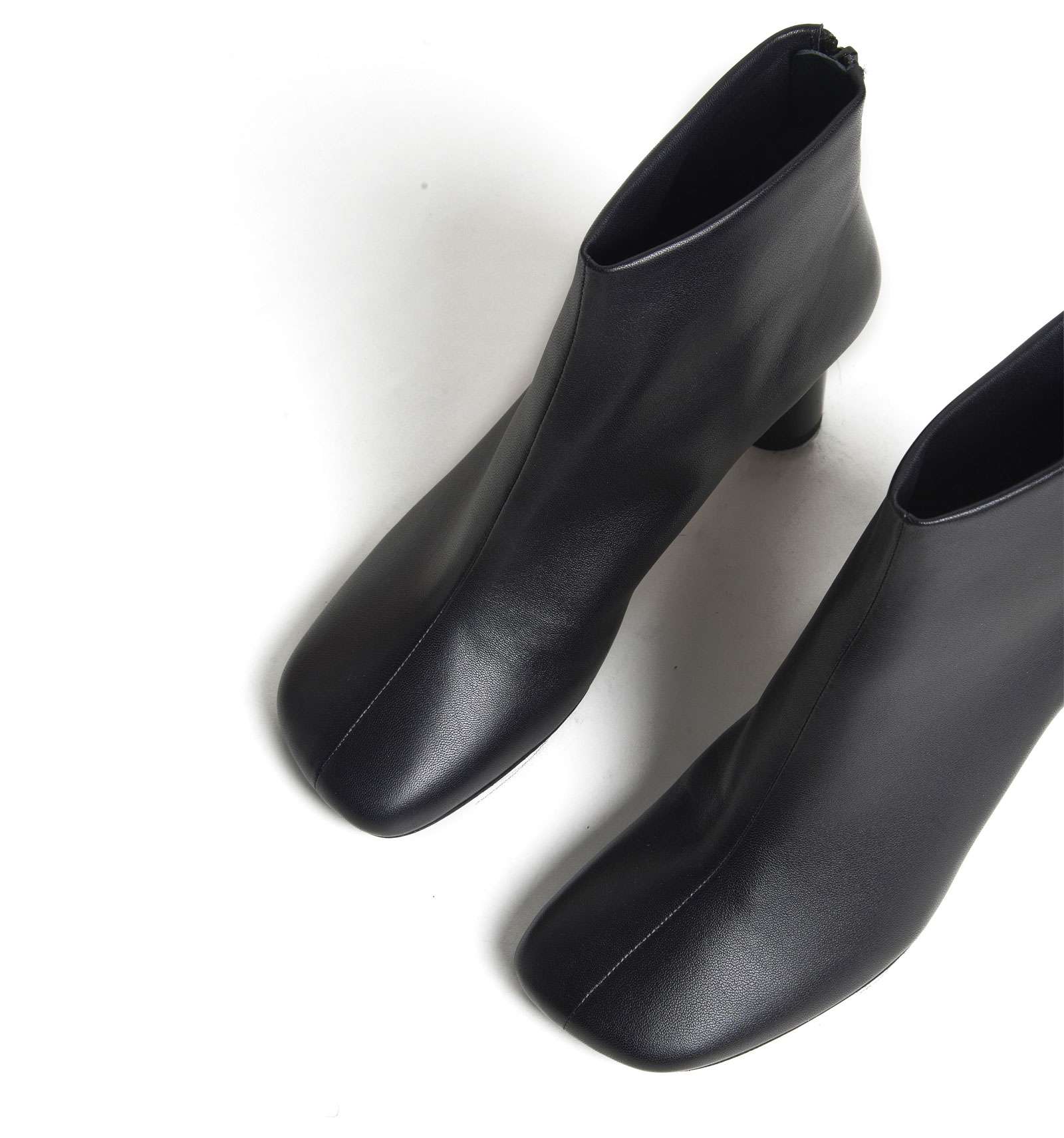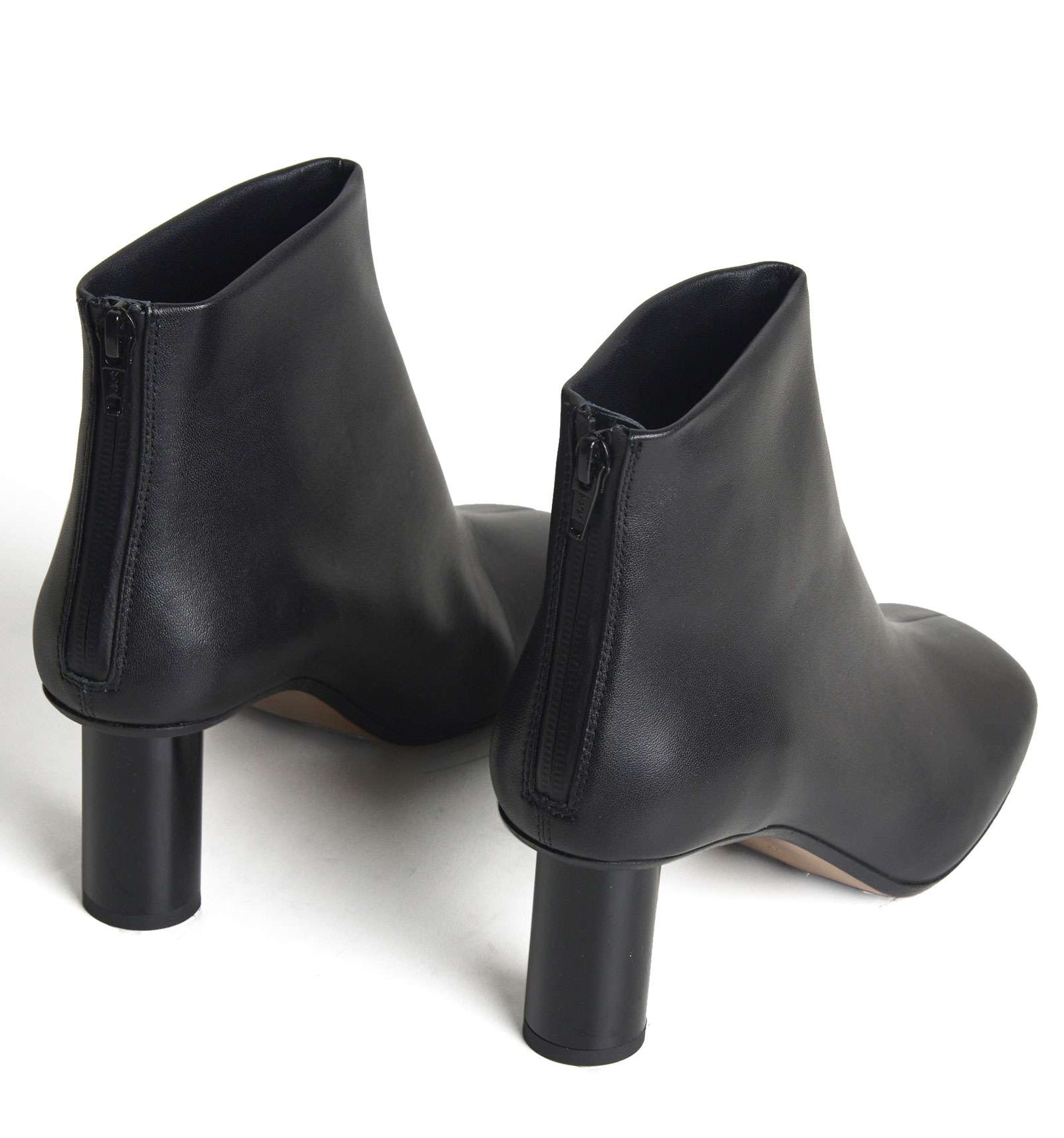 Tronchetto in vera pelle liscia color nero, fondo in vera pelle, cerniera sul retro, tacco laccato lucido.