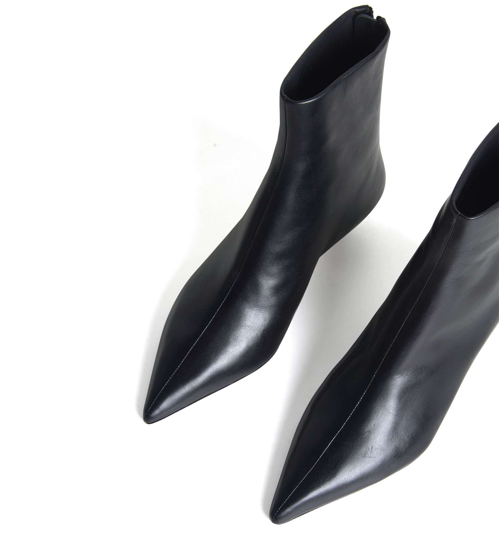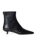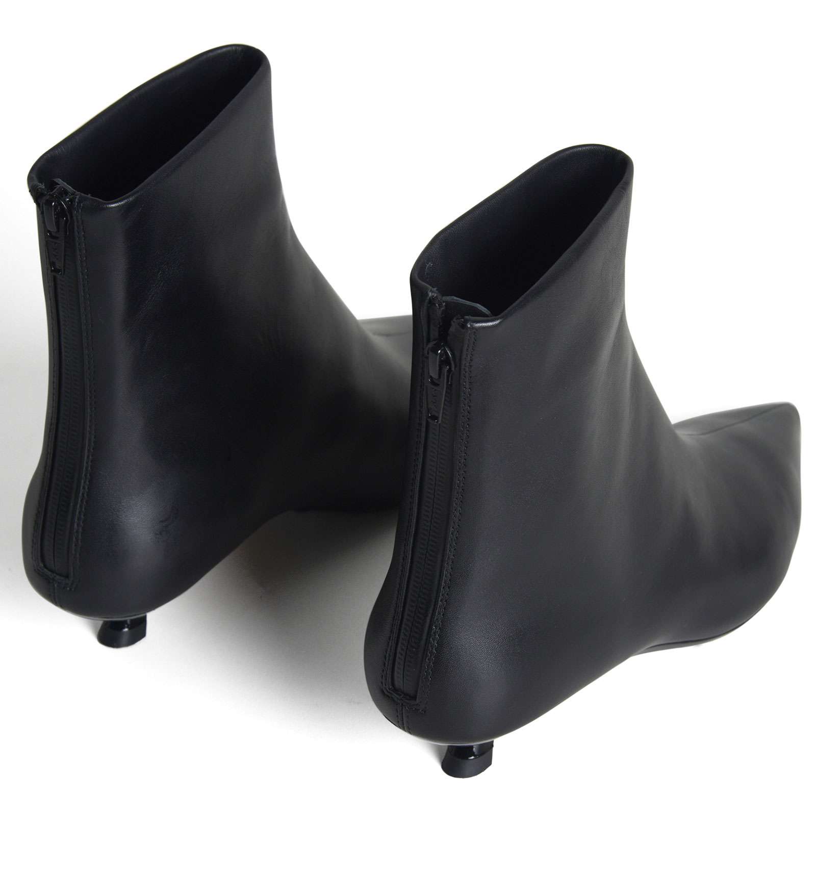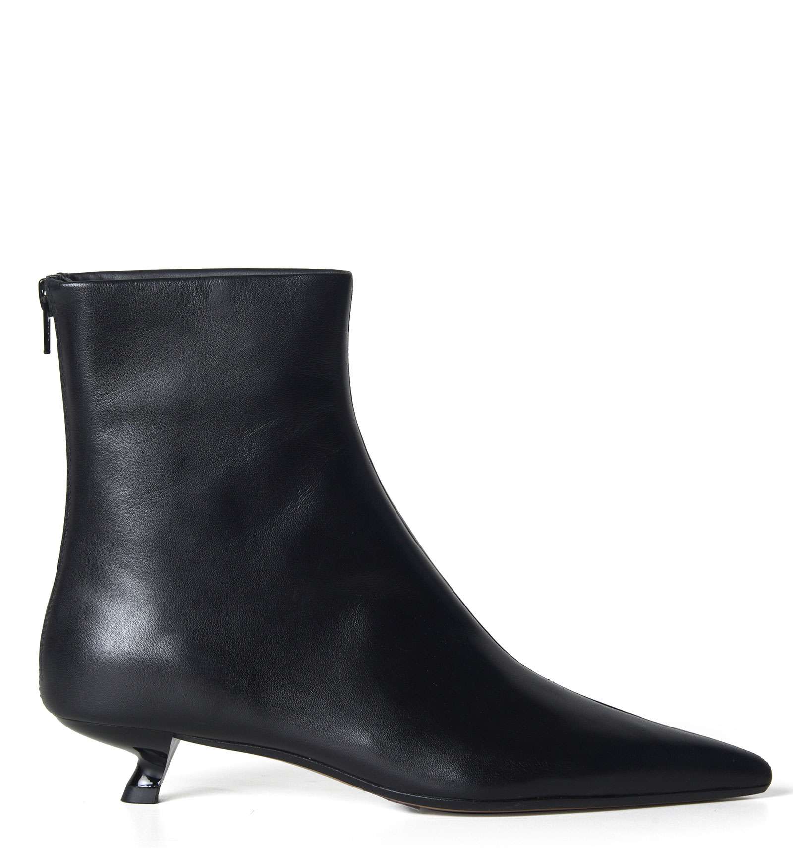 Tronchetto in vera pelle liscia color nero, fondo in vera pelle, cerniera sul retro, tacco laccato lucido. Altezza tacco 3 cm.
